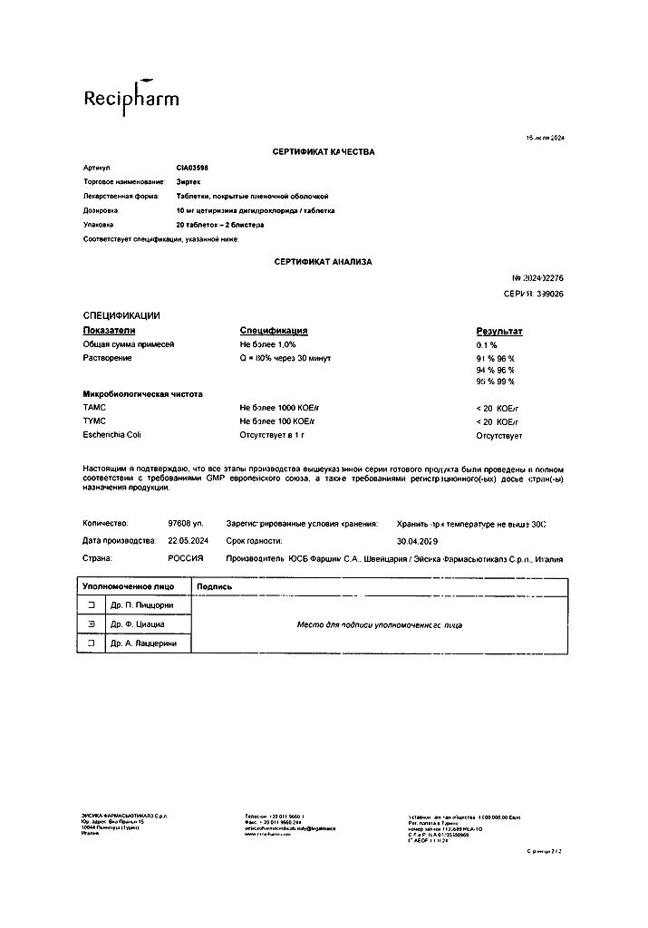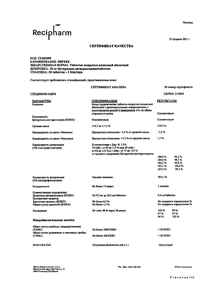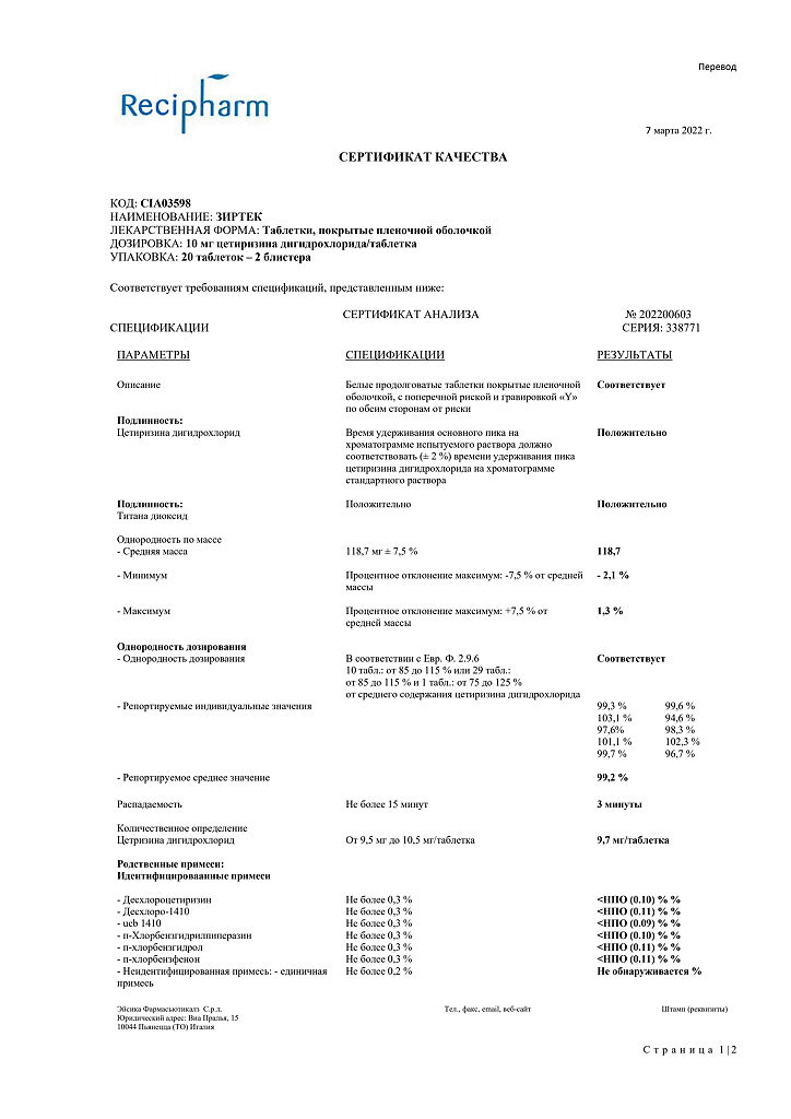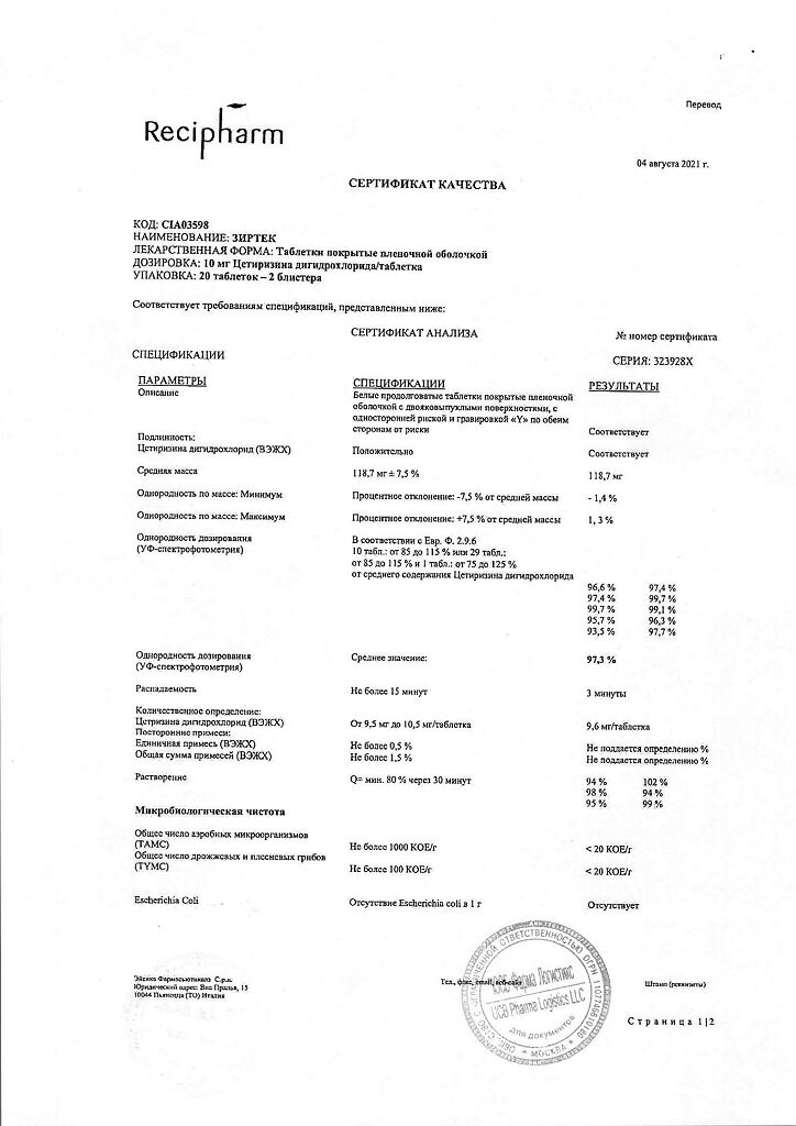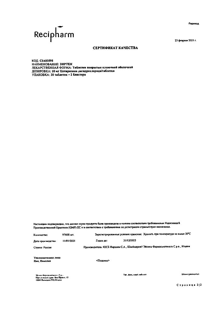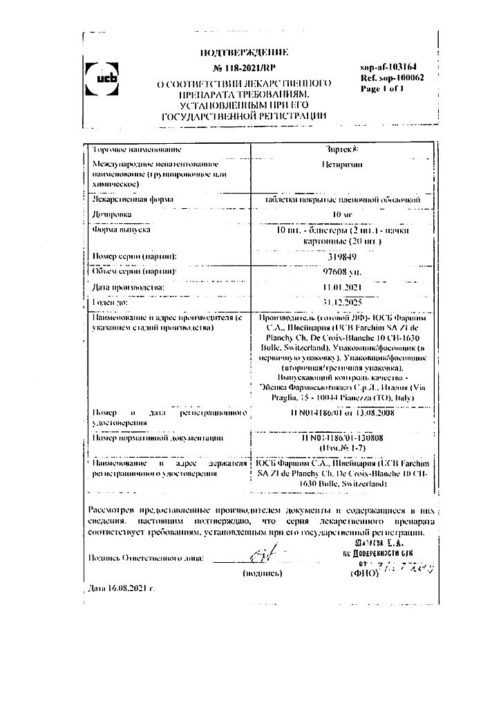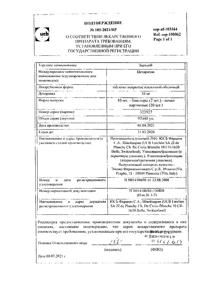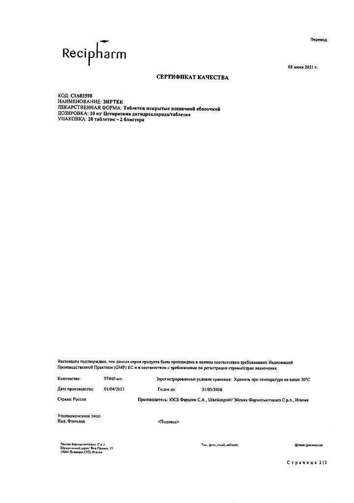 Действующее вещество: Цетиризин