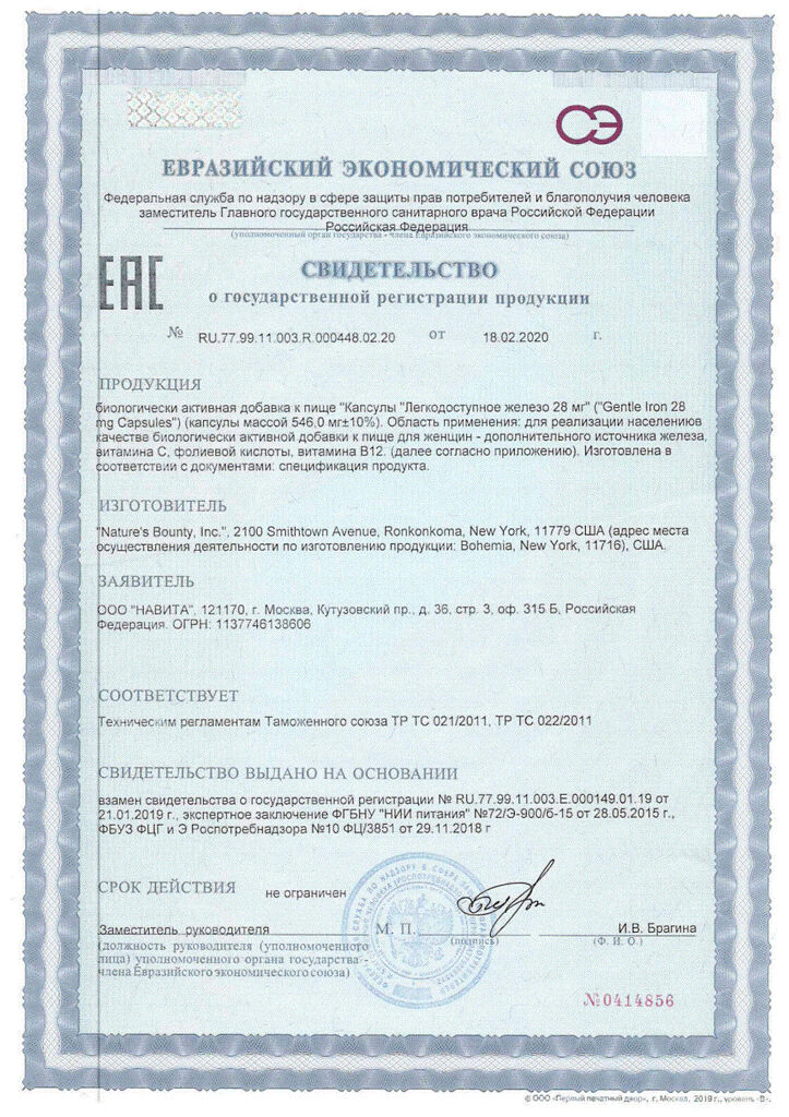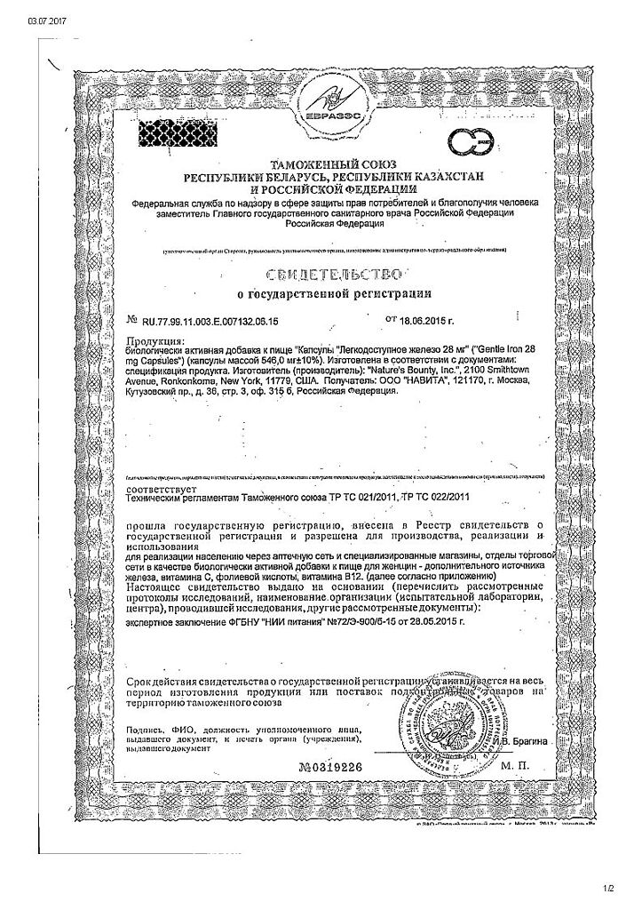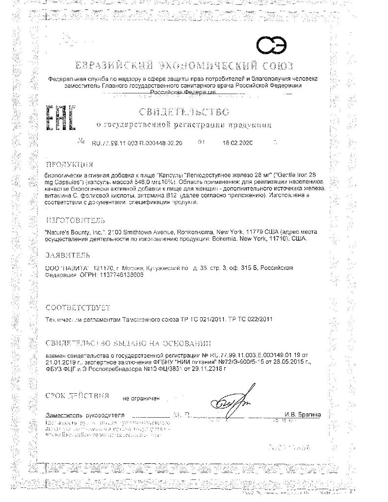 Документы Nature's Bounty Легкодоступное железо 28 мг / Gentle Iron 28 mg Capsules капсулы массой 546 мг 90 шт