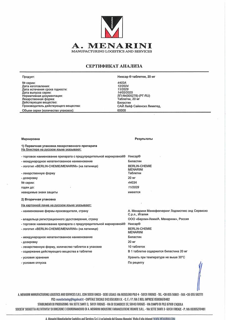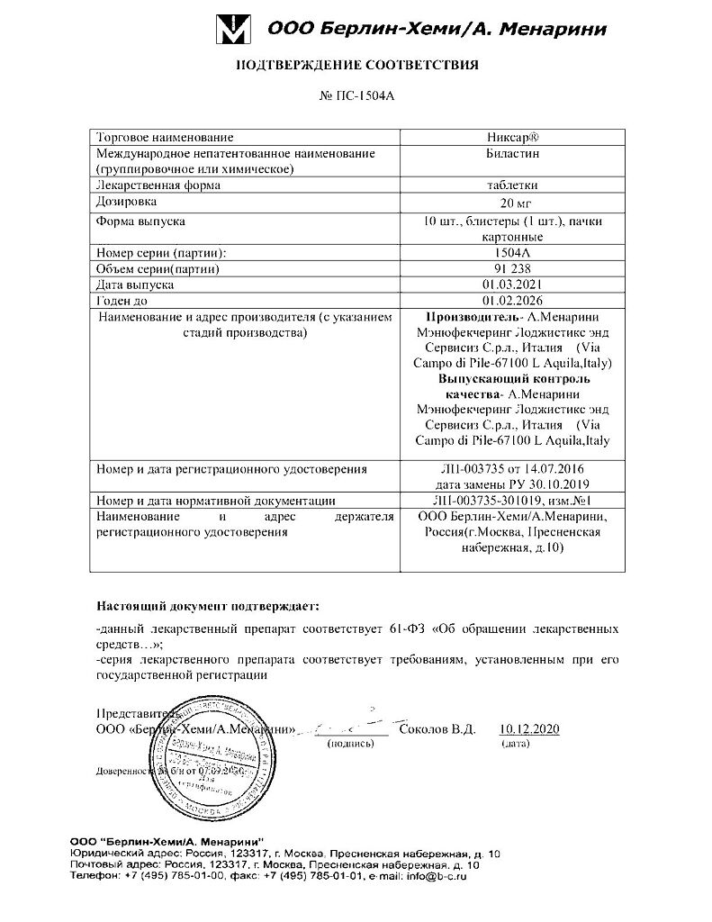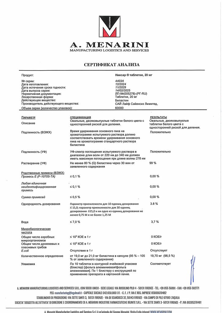 Взрослые и дети старше 12 лет: по 1 таблетке препарата Никсар, что соответствует 20 мг биластина, один раз в сутки.