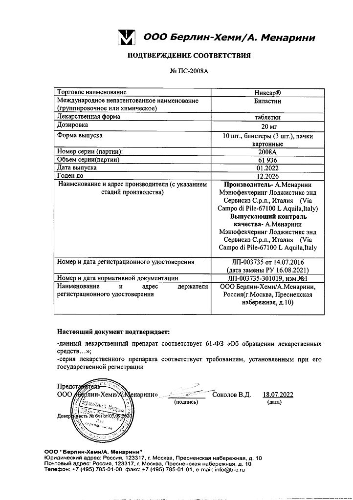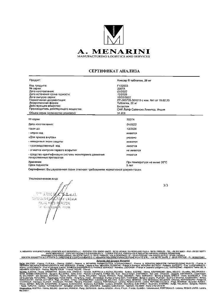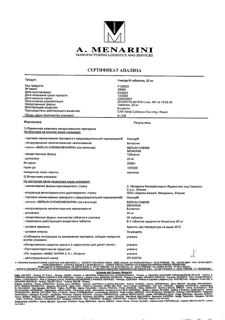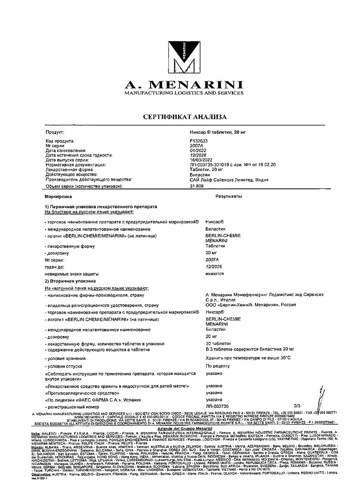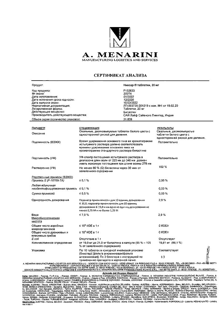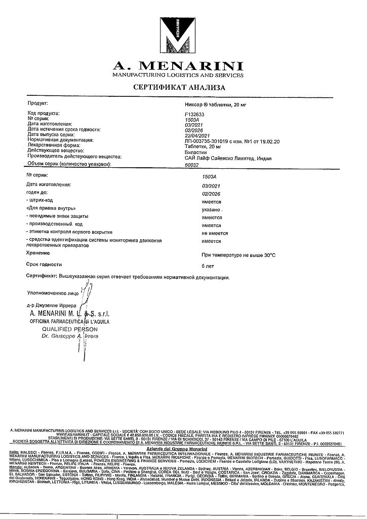 Производитель: А.Менарини Мэнюфекчеринг Лоджистикс энд Сервисиз С, Италия