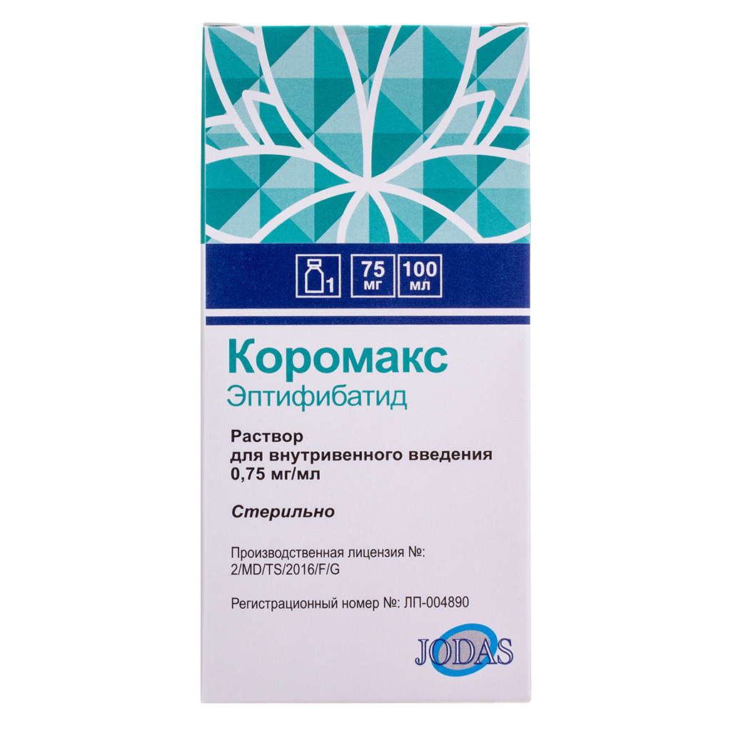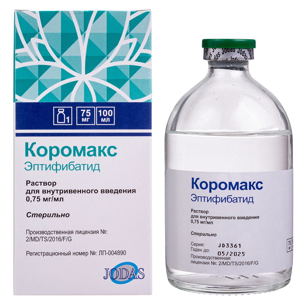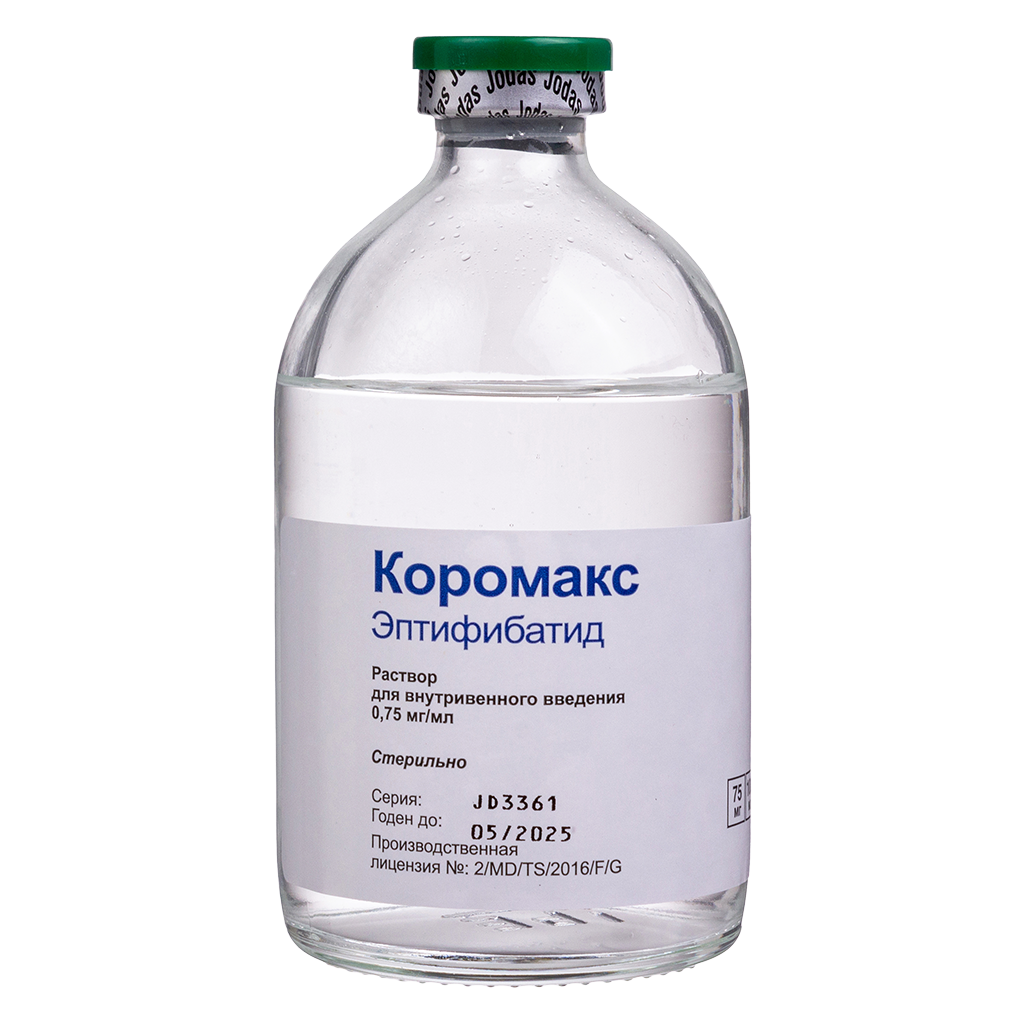 Эптифибатид вызывает зависимое от дозы и концентрации подавление агрегации тромбоцитов, что было продемонстрировано ex vivo с применением АДФ и других агонистов, индуцирующих агрегацию тромбоцитов. Действие эптифибатида наблюдается немедленно после в/в болюсного введения в дозе 180 мкг/кг. Режим с последующим проведением непрерывной в/в инфузии в дозе 2 мкг/кг/мин обеспечивает более чем 80% ингибирование агрегации тромбоцитов ex vivo, индуцированной АДФ, при физиологических концентрациях кальция, у более чем 80% пациентов. Ингибирование агрегации тромбоцитов является обратимым; через 4 ч после прекращения непрерывной инфузии в дозе 2 мкг/кг/мин функция тромбоцитов более чем на 50% восстанавливается до исходного уровня. При проведении измерений АДФ-индуцированной агрегации тромбоцитов ex vivo при физиологических концентрациях кальция (антикоагулянт D-фенилаланил-L-пролил-L-аргинин хлорметилкетон) у пациентов с нестабильной стенокардией и инфарктом миокарда без зубца Q было выявлено зависимое от концентрации ингибирование с IC50 (концентрация, ингибирующая агрегацию на 50%), составляющей 557 нг/мл, и IC80 (концентрация, ингибирующая агрегацию на 80%), составляющей 1107 нг/мл. Время кровотечения при применении препарата Коромакс в/в в виде болюса и инфузии обратимо увеличивается до 5 раз, этот показатель возвращается к исходному уровню в течение 2–6 ч после прекращения инфузии. При применении в виде монотерапии эптифибатид не оказывает значимого влияния на ПВ и АЧТВ.