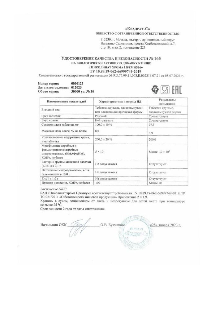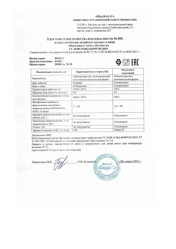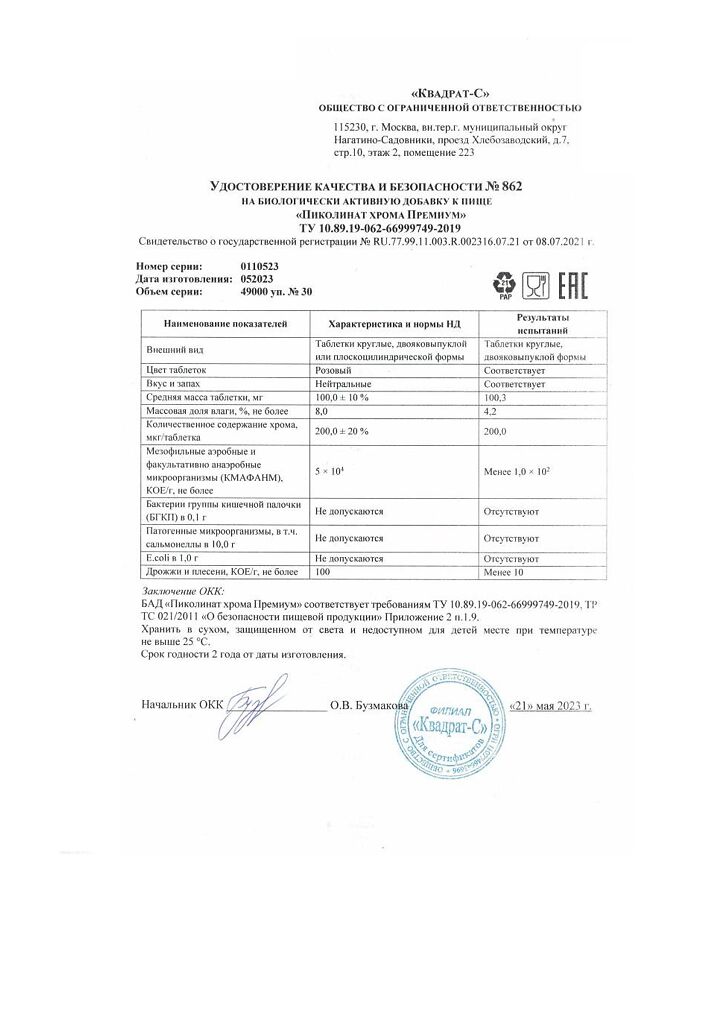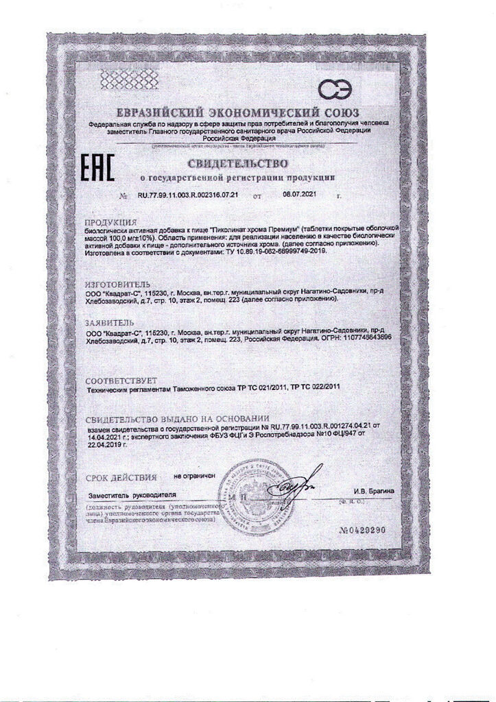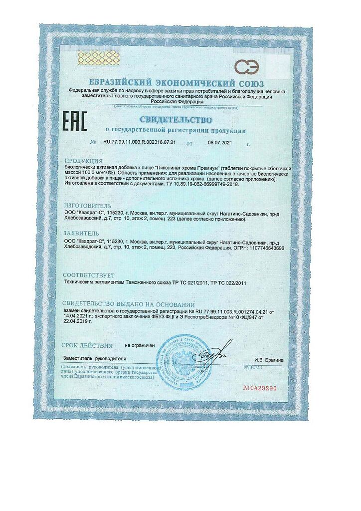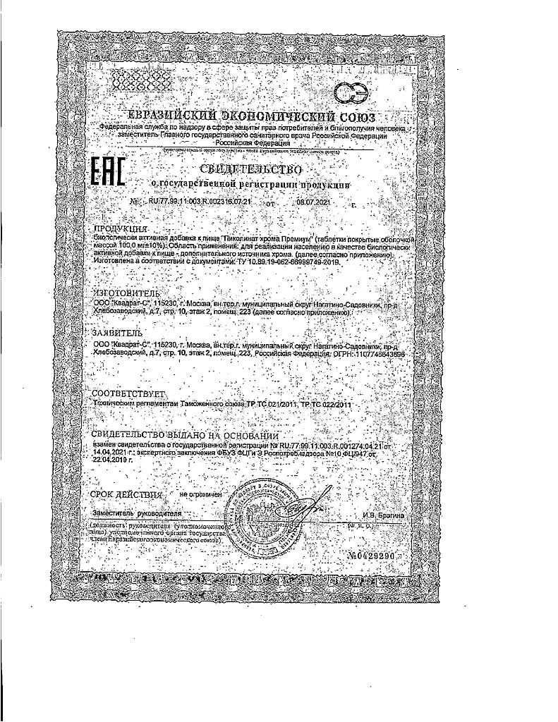 Документы Пиколинат хрома Премиум Витамир таблетки покрыт.об.массой 100 мг 30 шт
