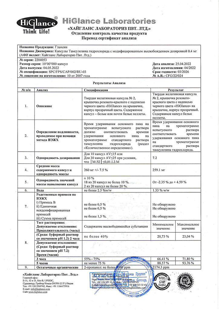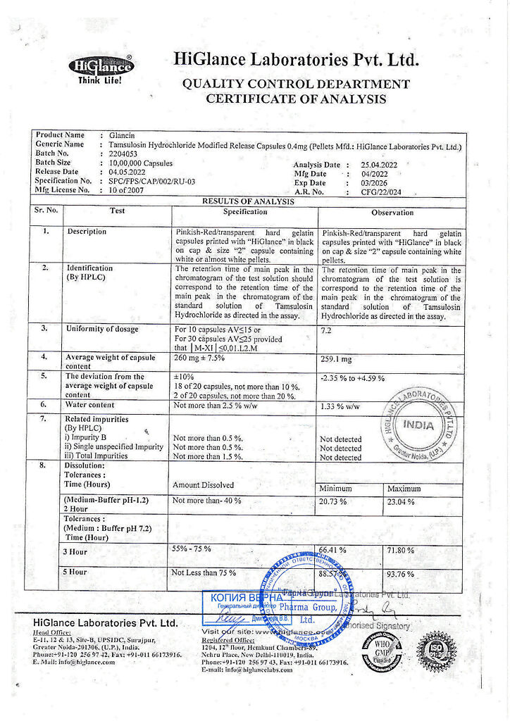 Документы Глансин капсулы с модифицированным высвобождением 0,4 мг 30 шт