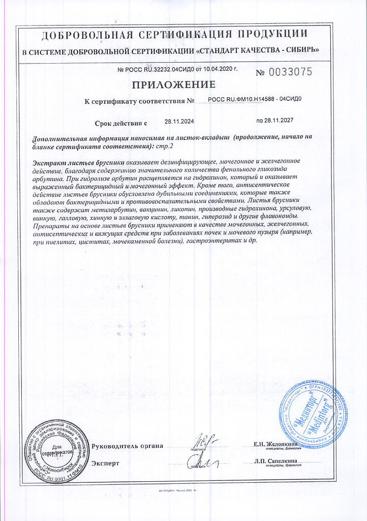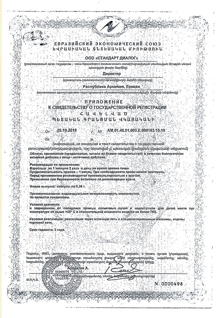 Рекомендуется в качестве биологически активной добавки к пище  - источника Арбутина.
