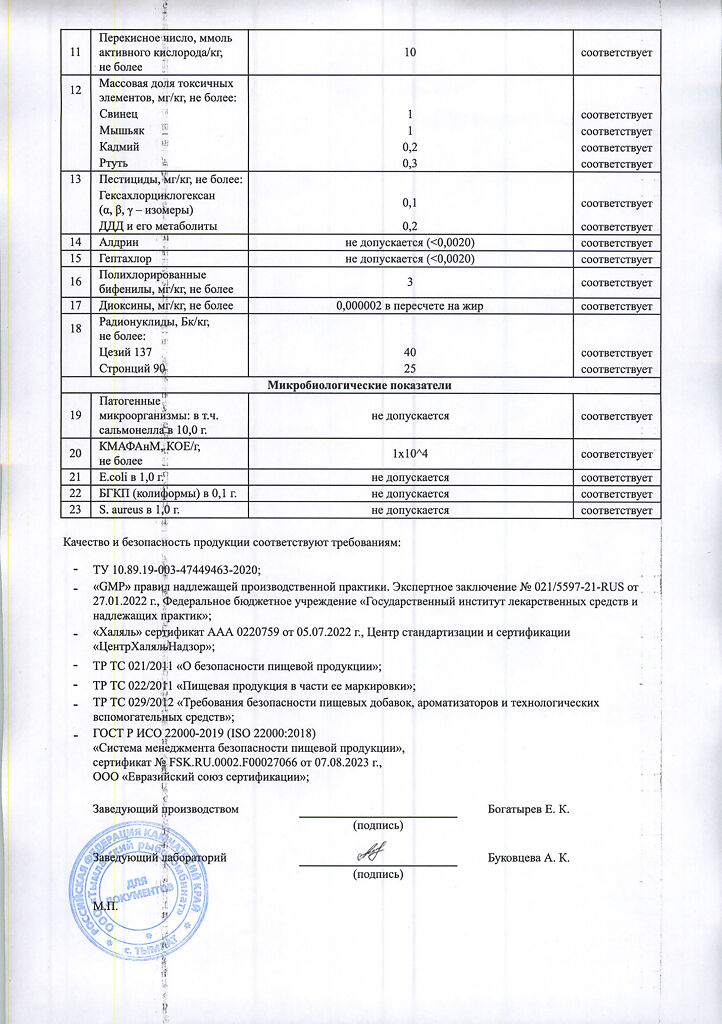 Средние значения в 1 капсуле продукта: белки – 0,1 г, жиры – 0,3 г, углеводы – 0 г, 13 кДж / 3 кКал.