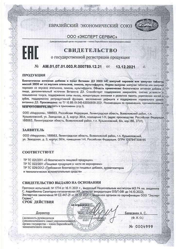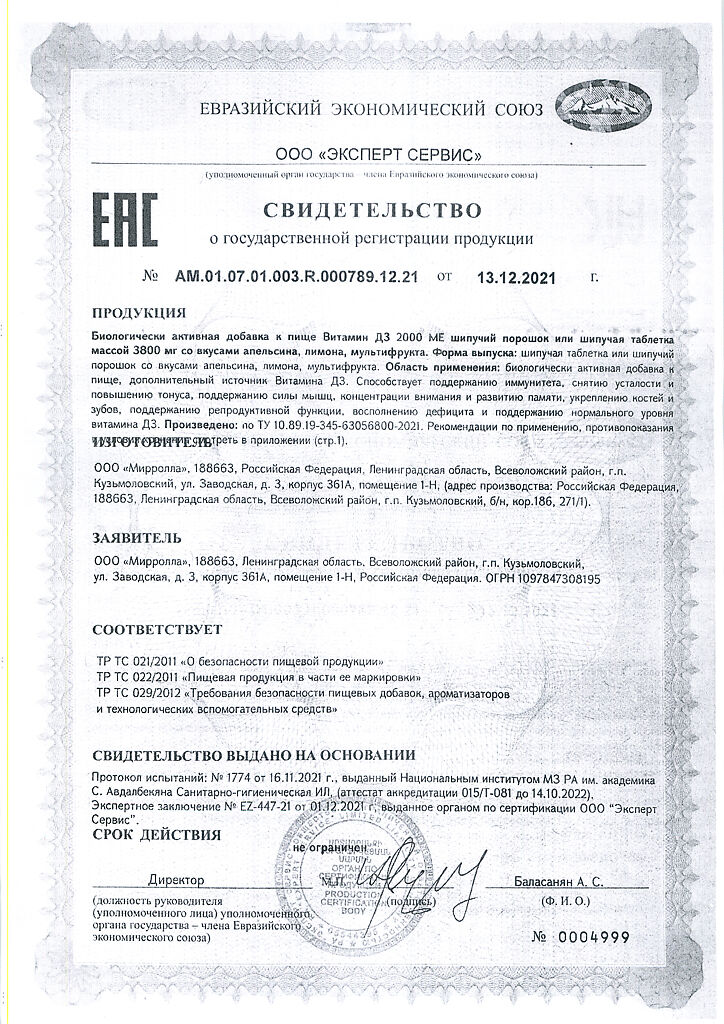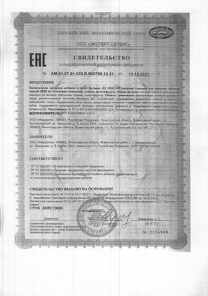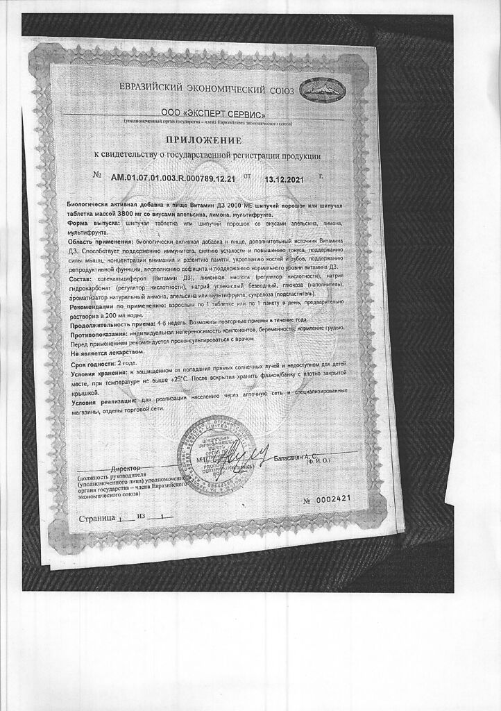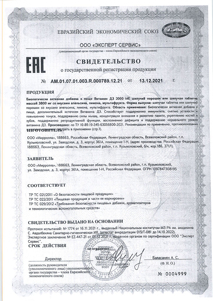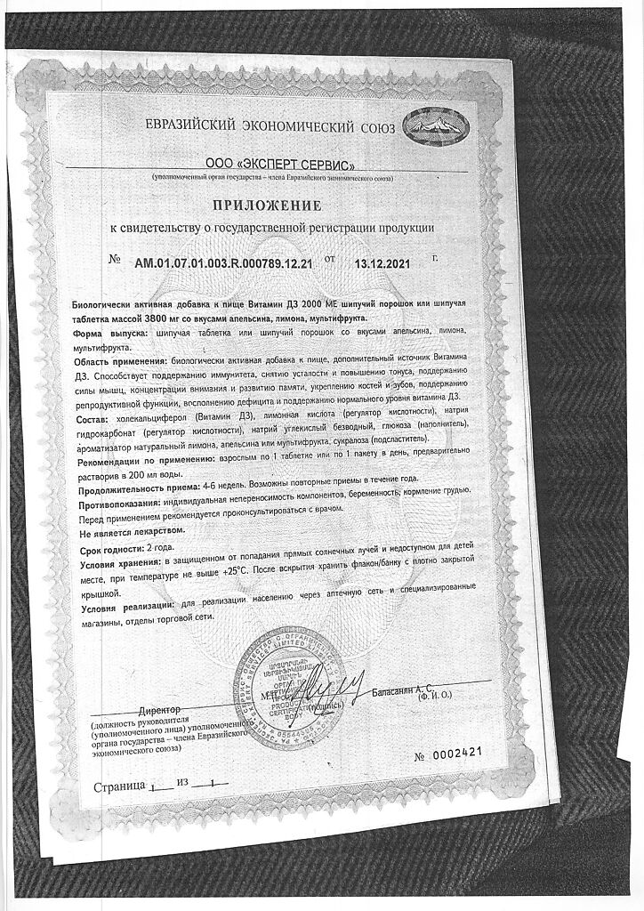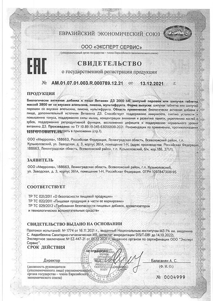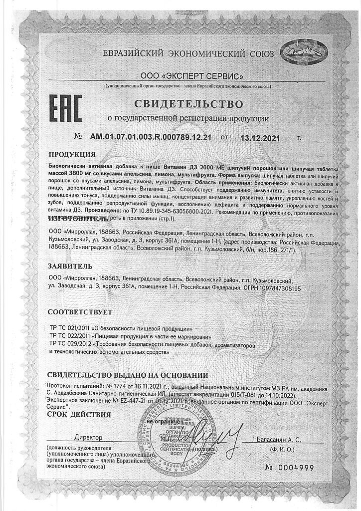 Документы Mirrolla Витамин Д3 2000 МЕ шипучие таблетки массой со вкусом апельсина 3800 мг 20 шт