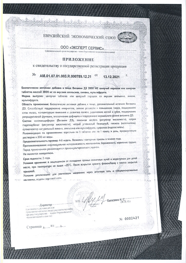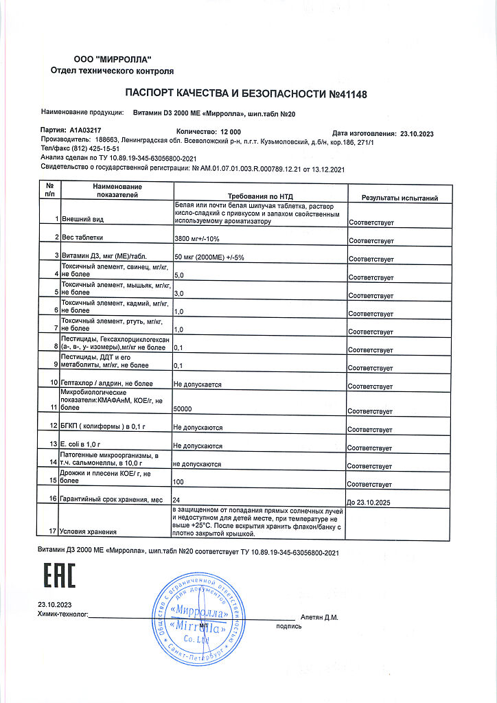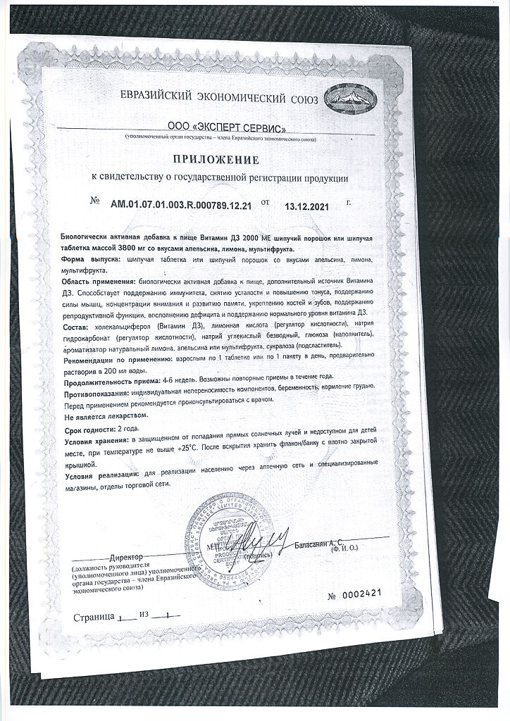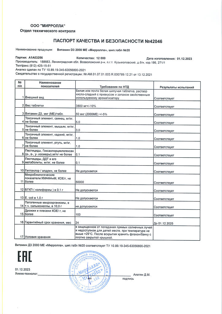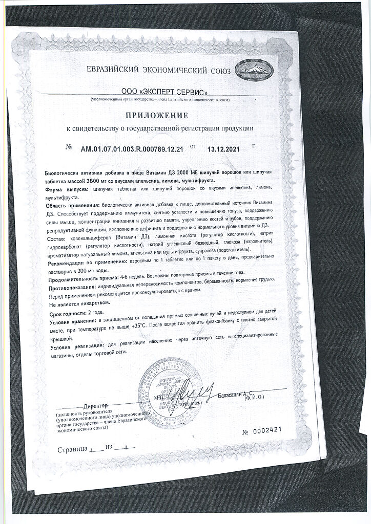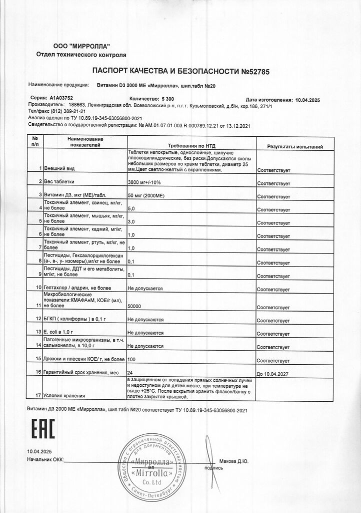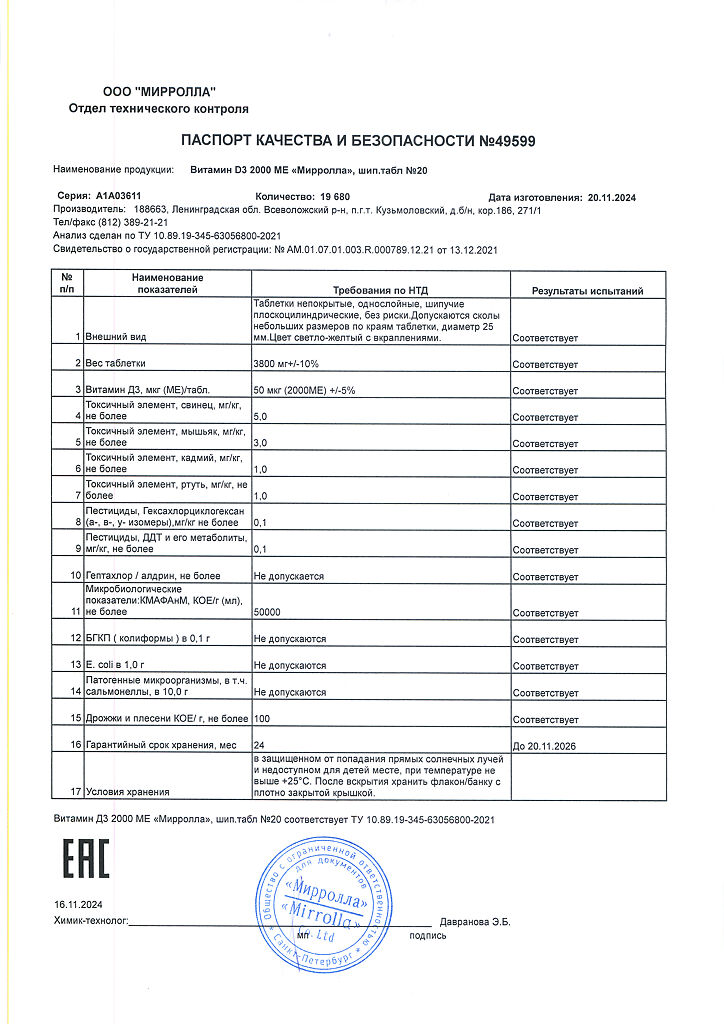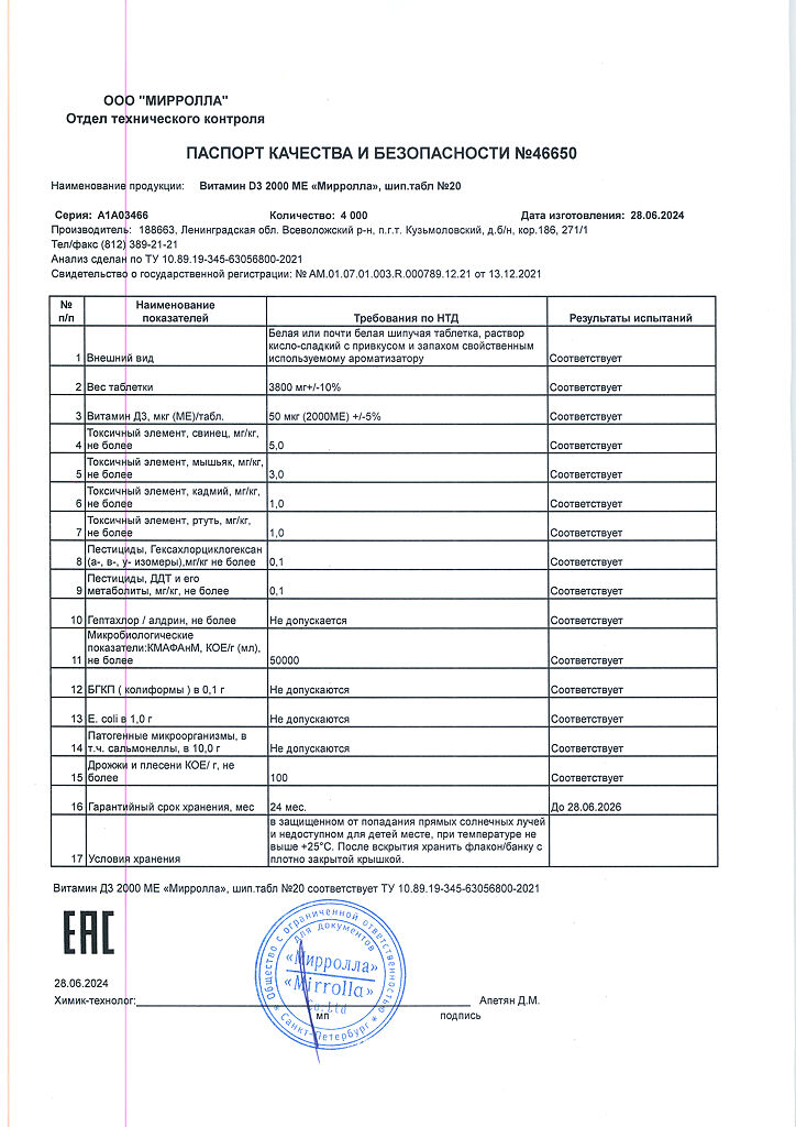 Документы Mirrolla Витамин Д3 2000 МЕ шипучие таблетки массой со вкусом апельсина 3800 мг 20 шт