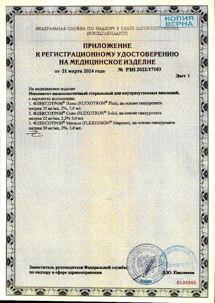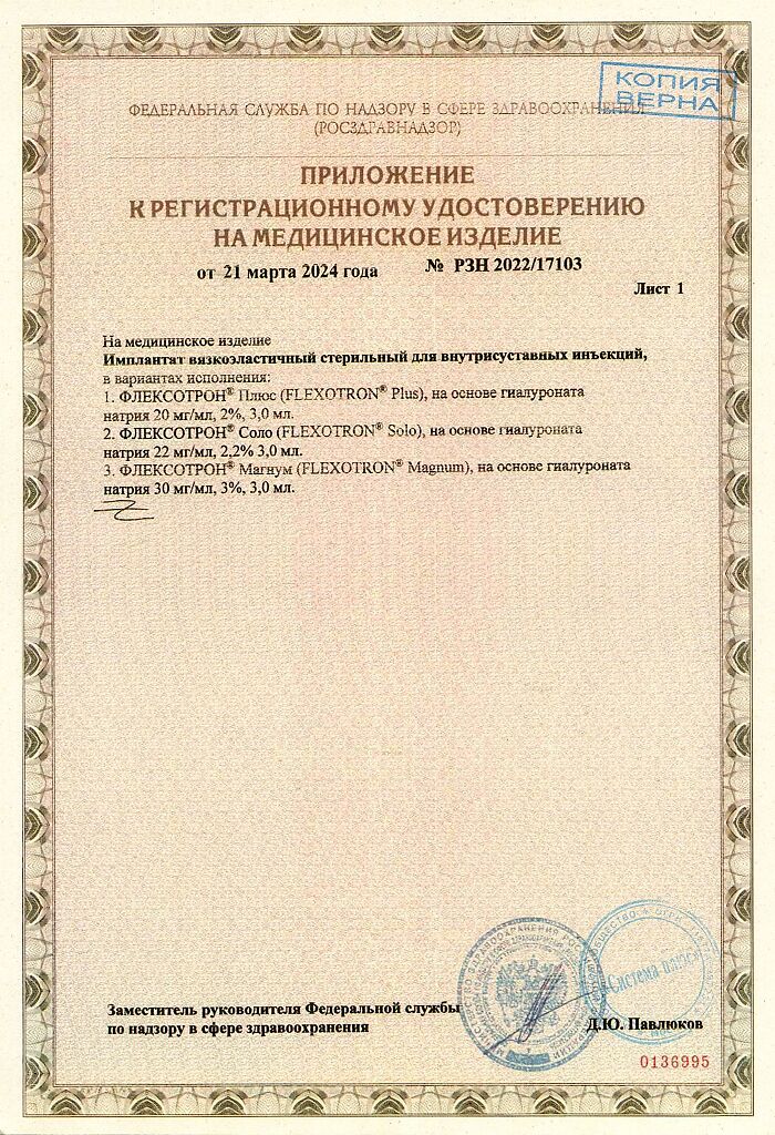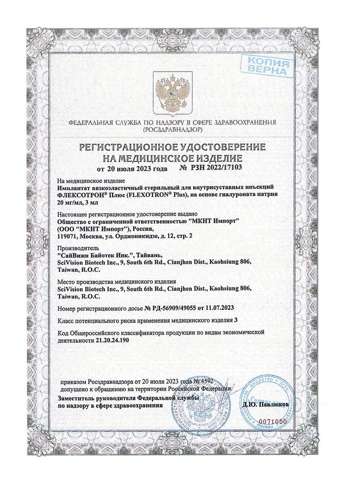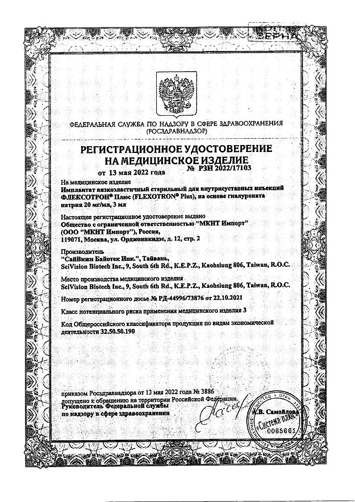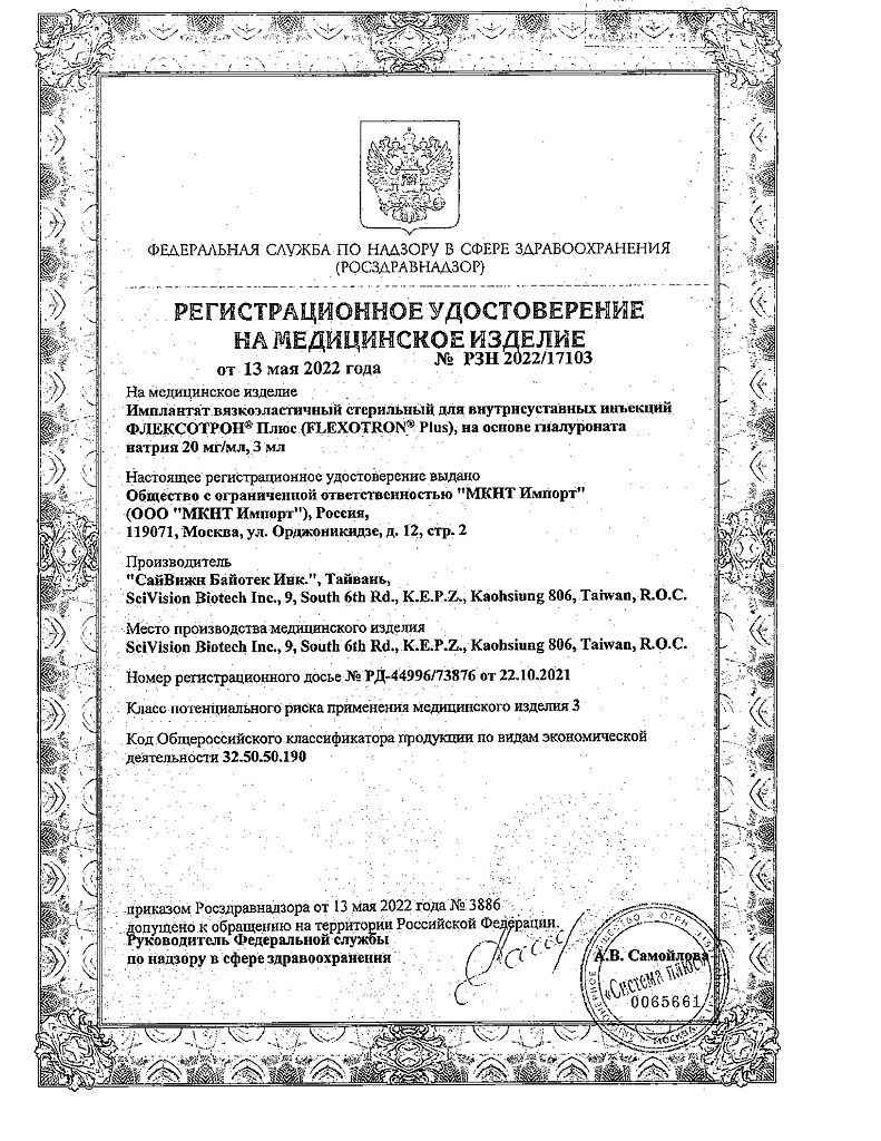 Документы Флексотрон Плюс имплантат стерильный для внутрисуставных инъекций 2% 20 мг/мл шприц 3 мл 1 шт