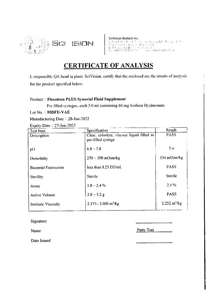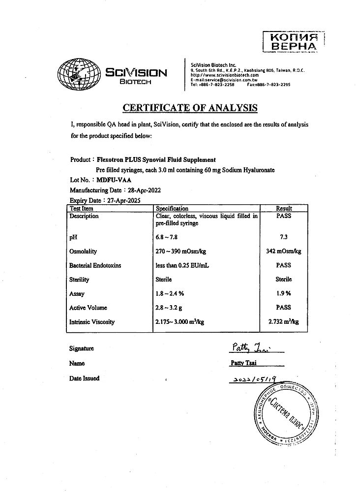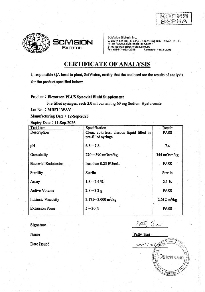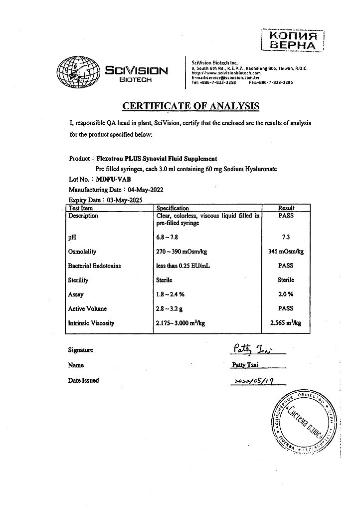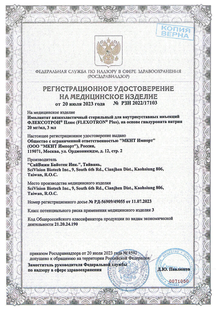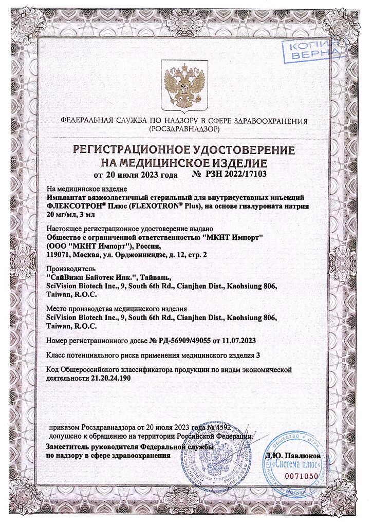 Документы Флексотрон Плюс имплантат стерильный для внутрисуставных инъекций 2% 20 мг/мл шприц 3 мл 1 шт