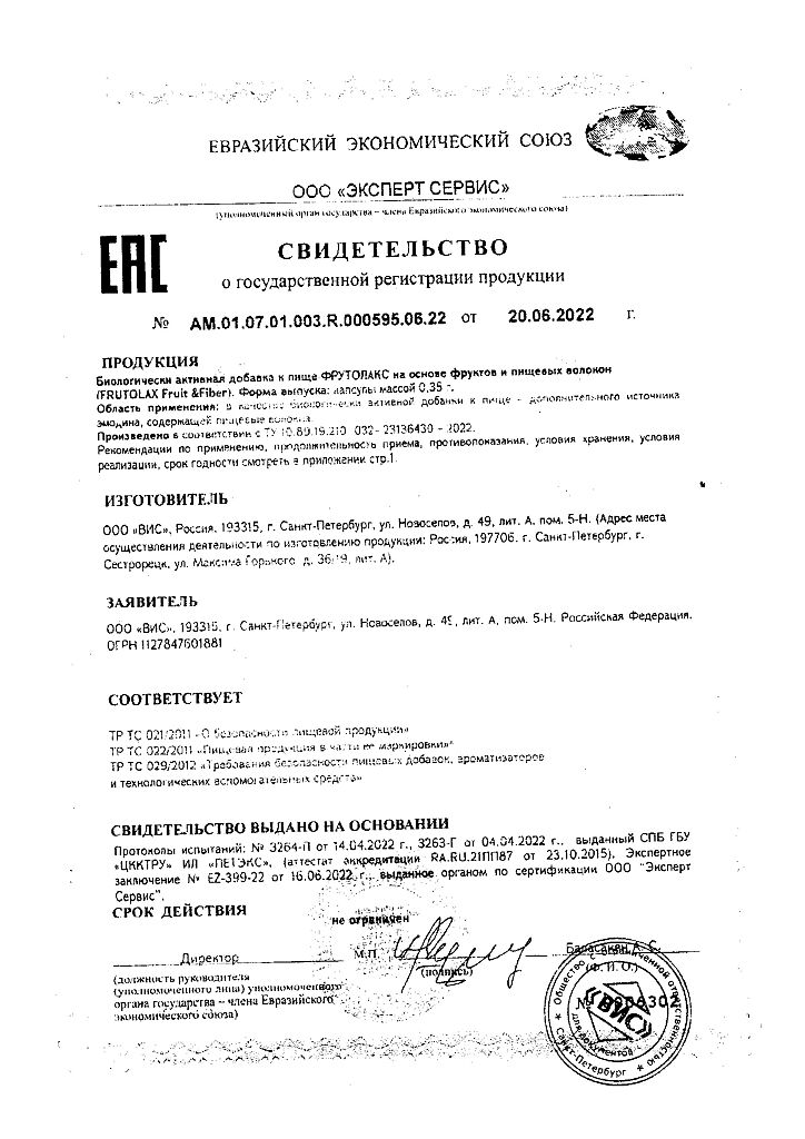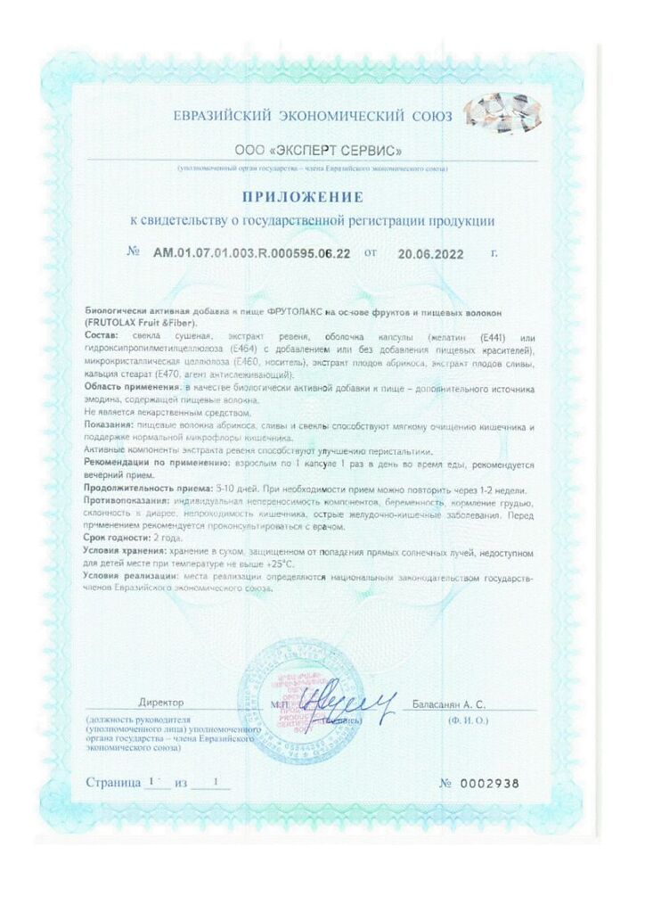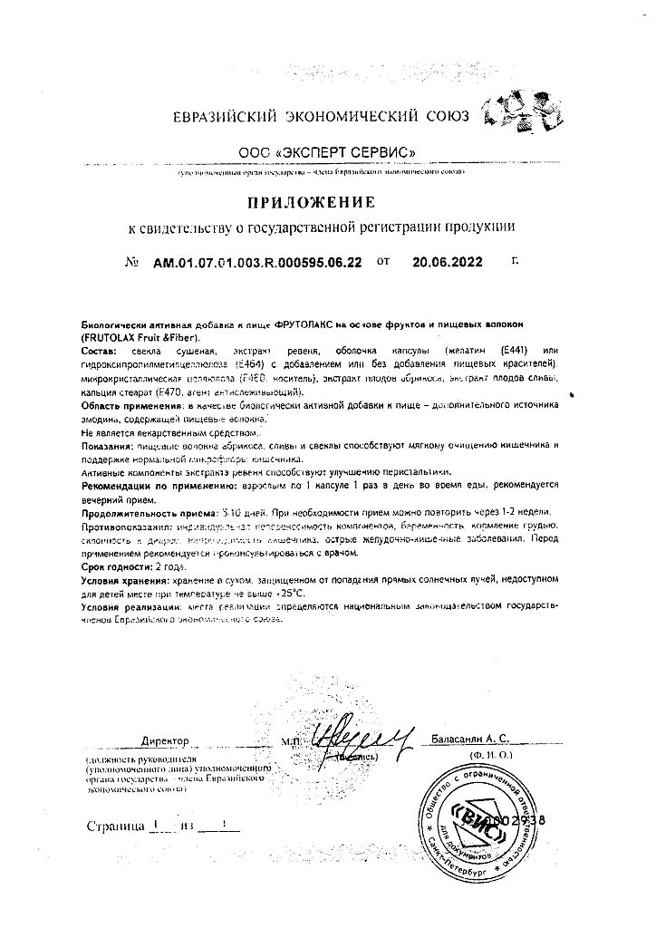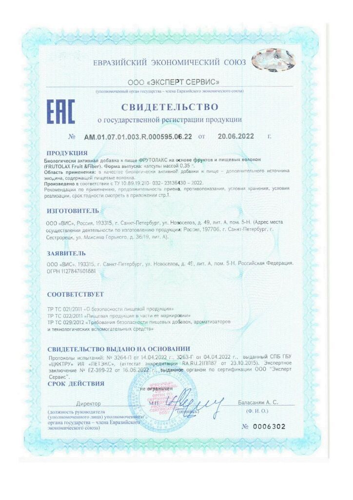 Документы ВИС Фрутолакс на основе фруктов и пищевых волокон капсулы массой 0,35 г 48 шт