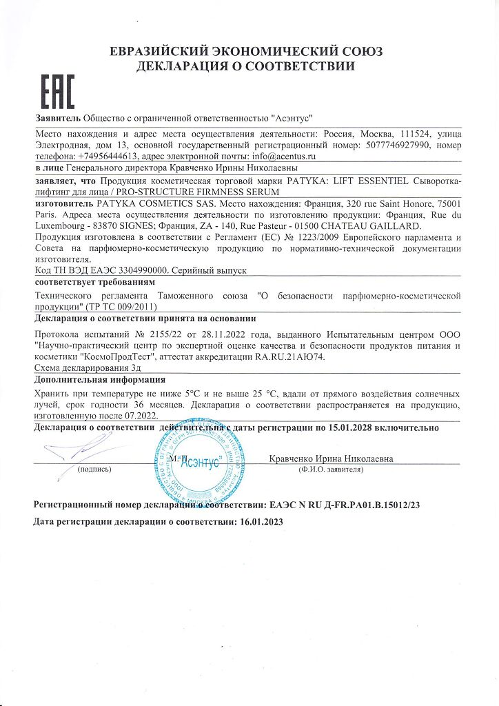 Документы Патика/Patyka Lift Essentiel Сыворотка-лифтинг для лица 30 мл 1 шт