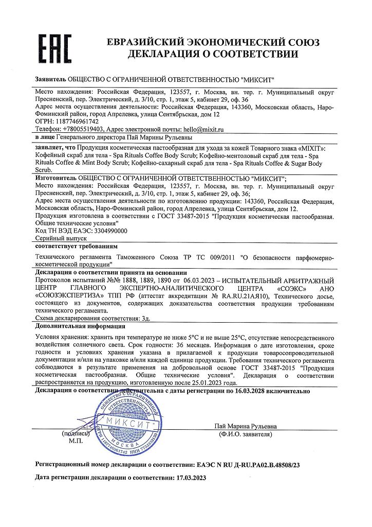 Документы Mixit Spa Rituals Кофейный скраб для тела Coffee Body Scrub 250 г