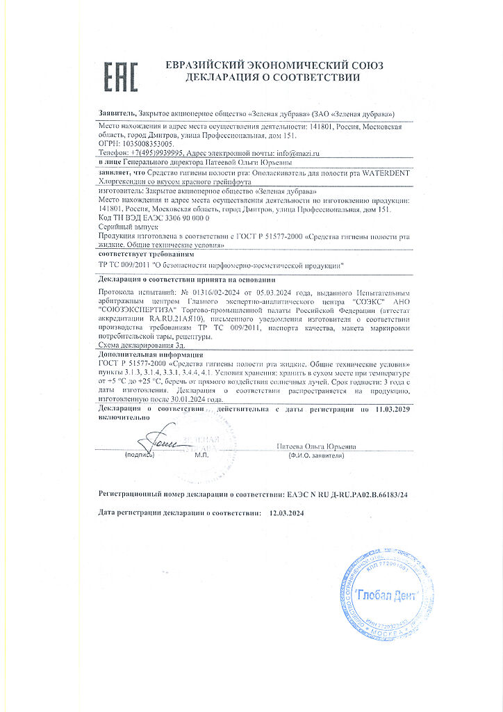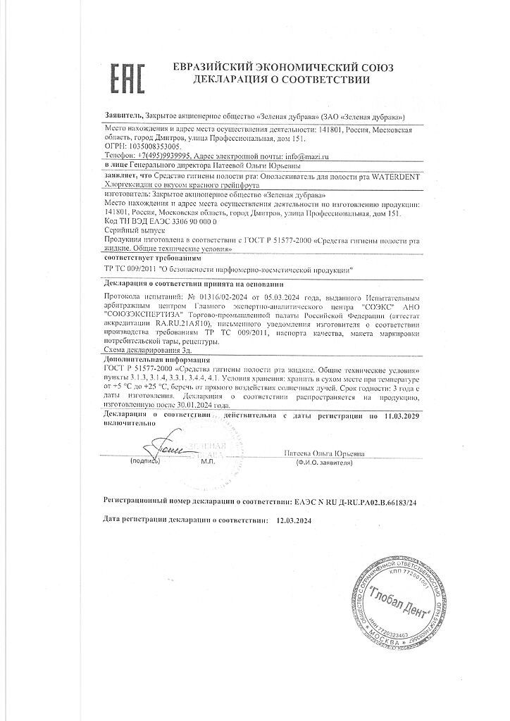 Документы WaterDent Ополаскиватель для полости рта Хлоргексидин со вкусом грейпфрута 500 мл 1 шт