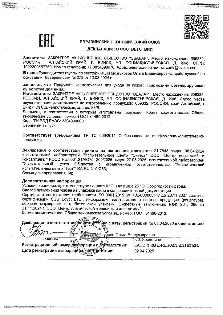 Документы Карнозин регенерирующая сыворотка для лица Evalar cosmetics 30 мл 1 шт