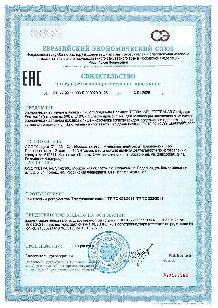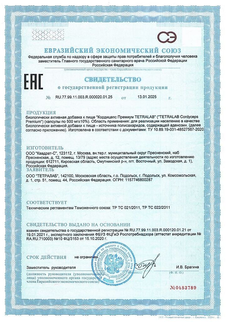 Документы Tetralab Кордицепс Премиум / Cordyceps Premium капсулы по 500 мг 60 шт