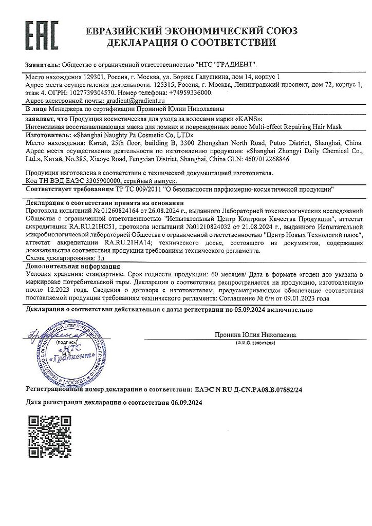 Документы KANS Интенсивная восстанавливающая маска для ломких и поврежденных волос Multi-effect Repairing Hair Mask 220 г 1 шт