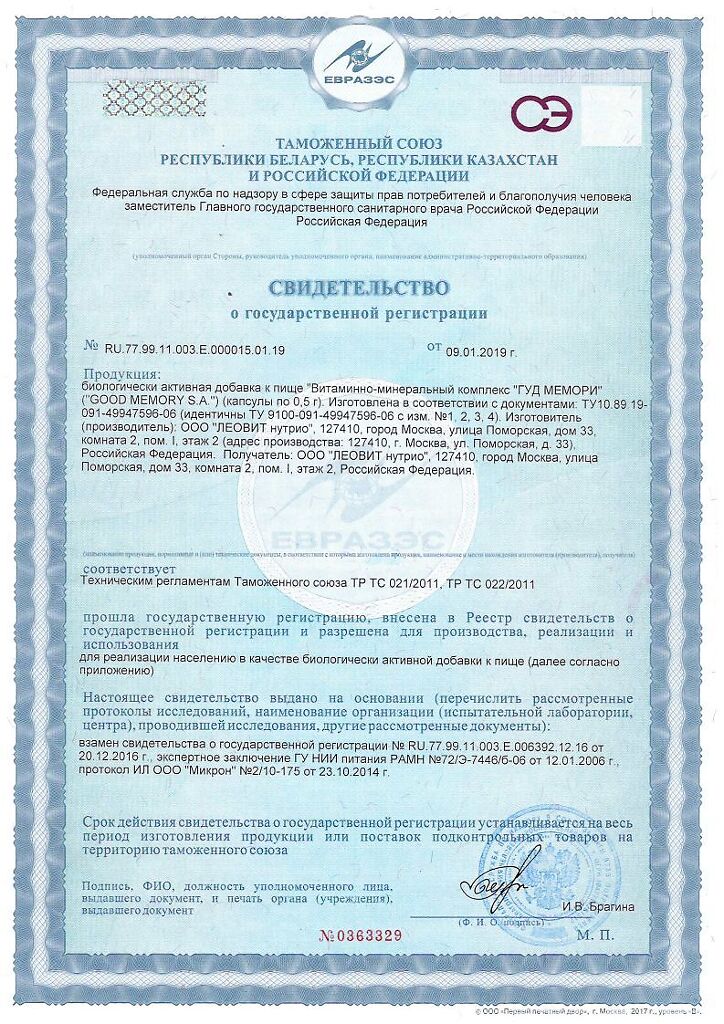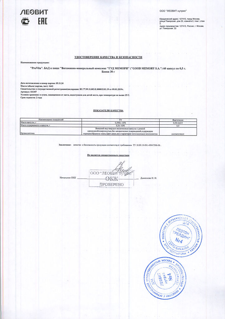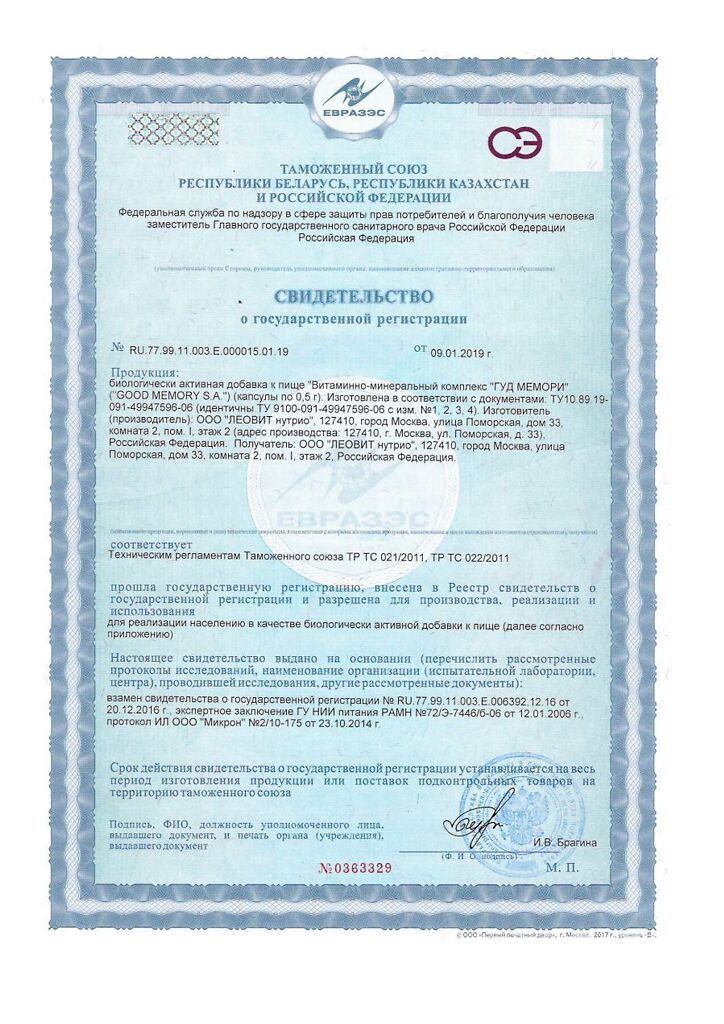 Документы Леовит Витаминно-минеральный комплекс Гуд Мемори / Good Memory S. A. капсулы по 0,5 г банка 60 шт