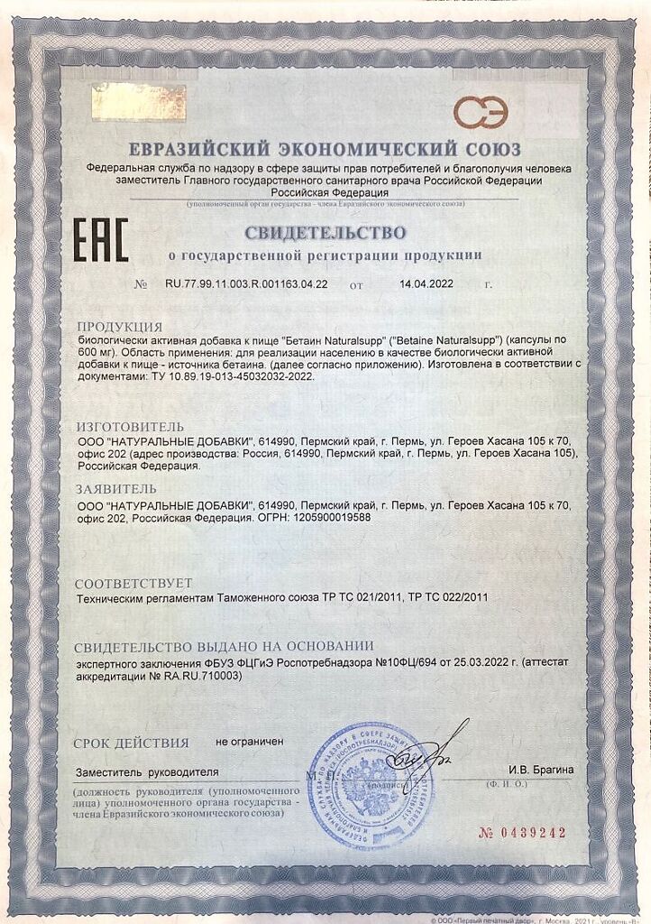 Документы NaturalSupp Бетаин/Betaine Naturalsupp капсулы по 600 мг 60 шт