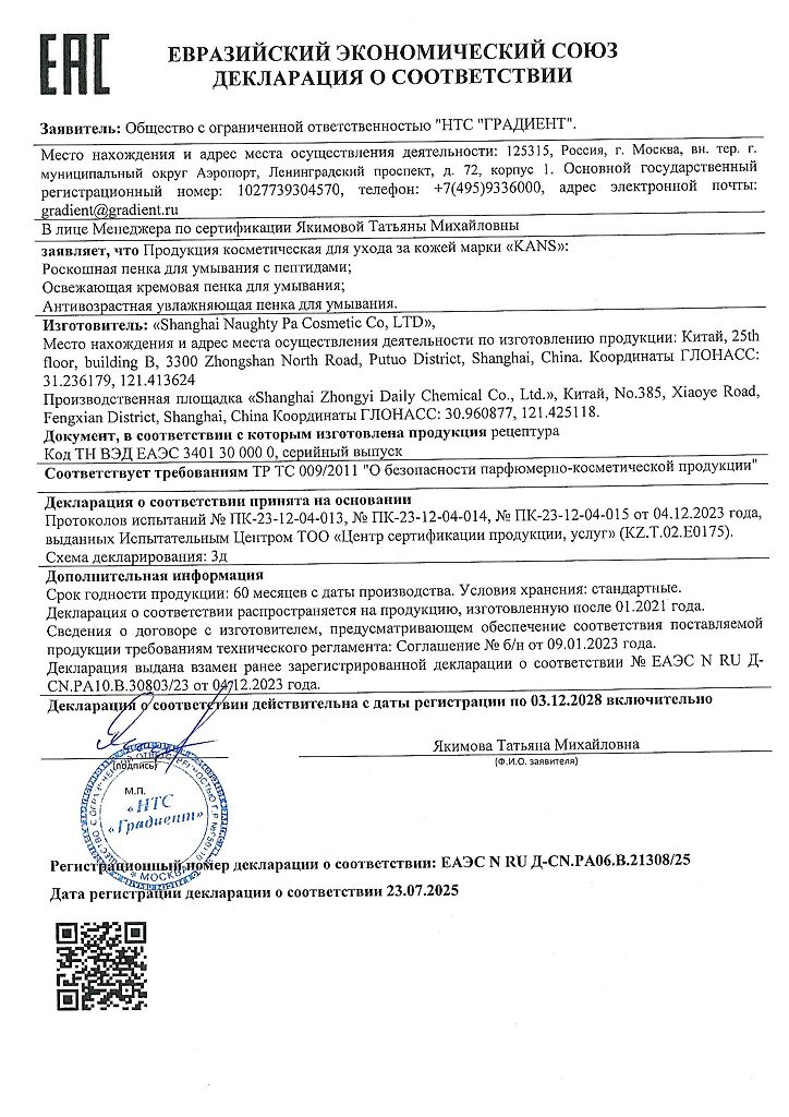Документы KANS Пенка для умывания с пептидами роскошная 100 г 1 шт
