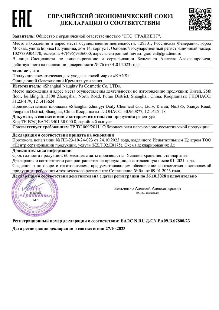 Документы KANS Крем для умывания освежающий очищающий 100 г 1 шт