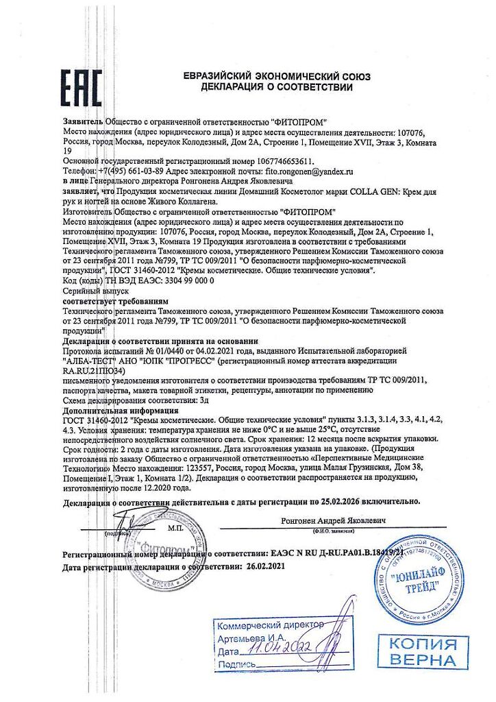 Документы Colla Gen Крем для рук и ногтей Hand Cream на основе живого коллагена 30 мл 1 шт