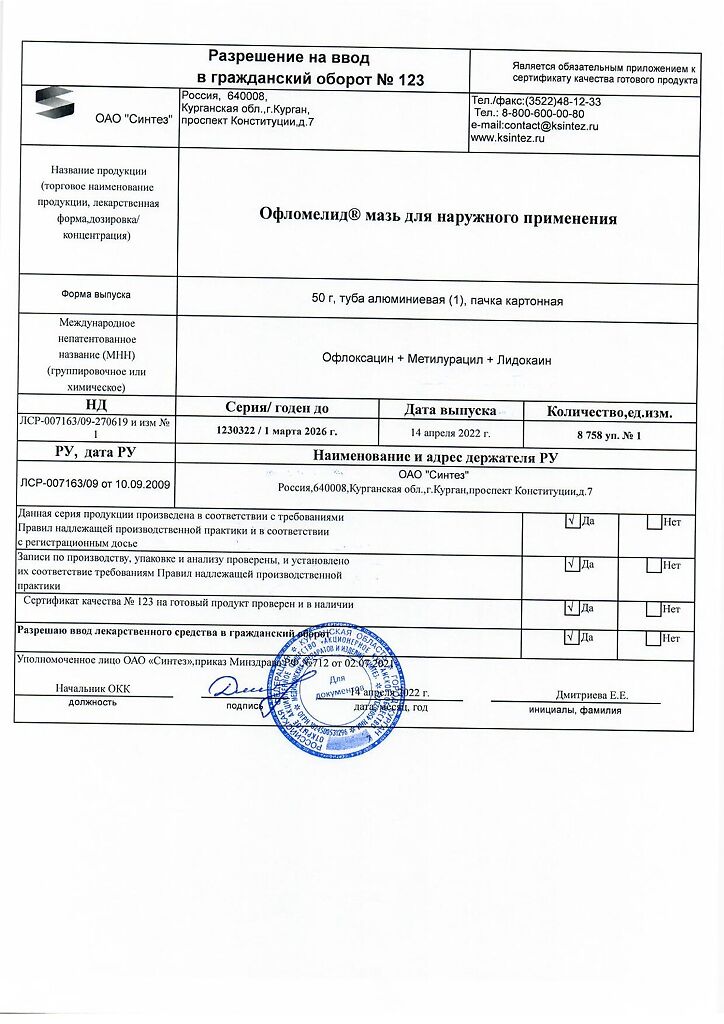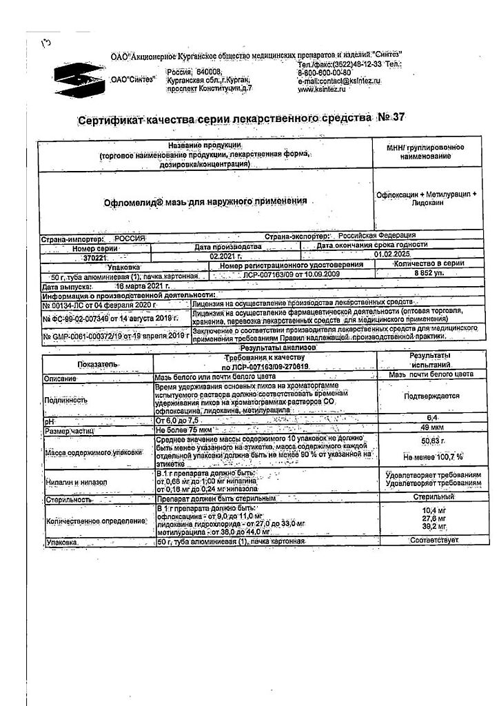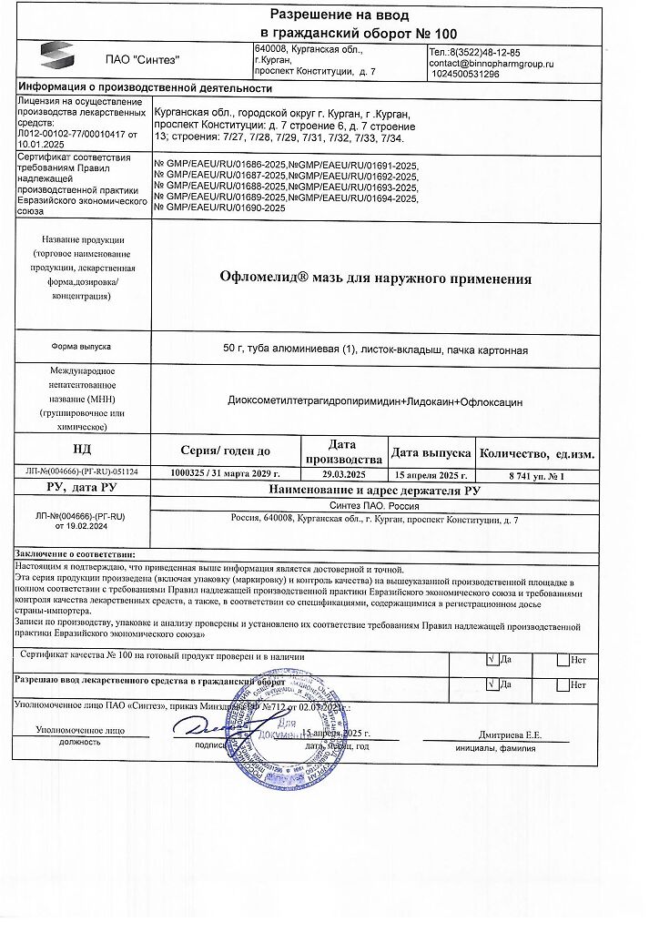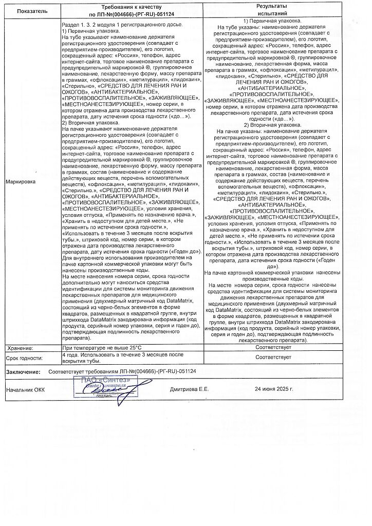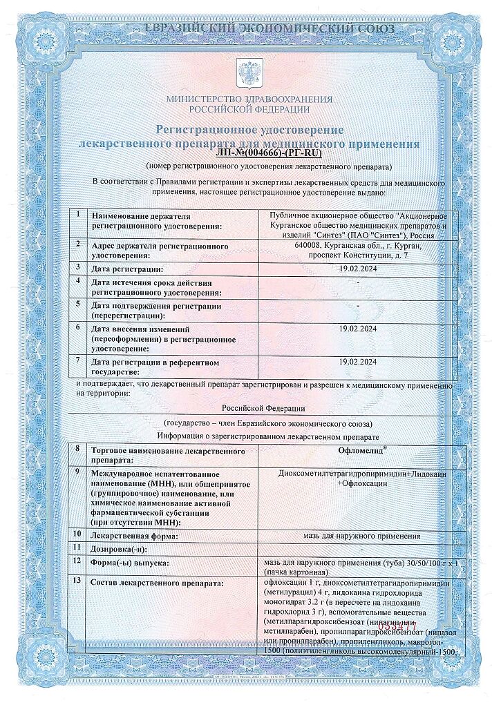 Действующее вещество: Диоксометилтетрагидропиримидин, Лидокаин, Офлоксацин