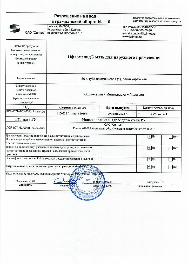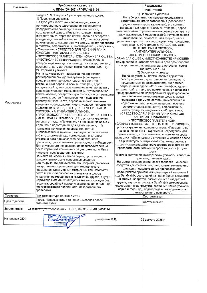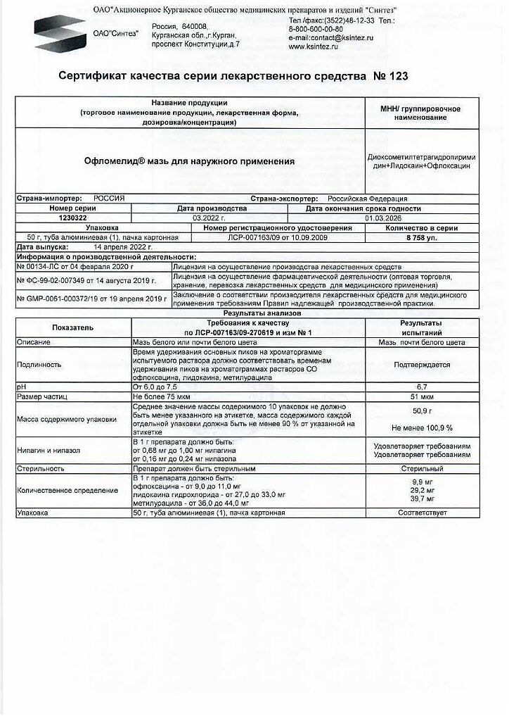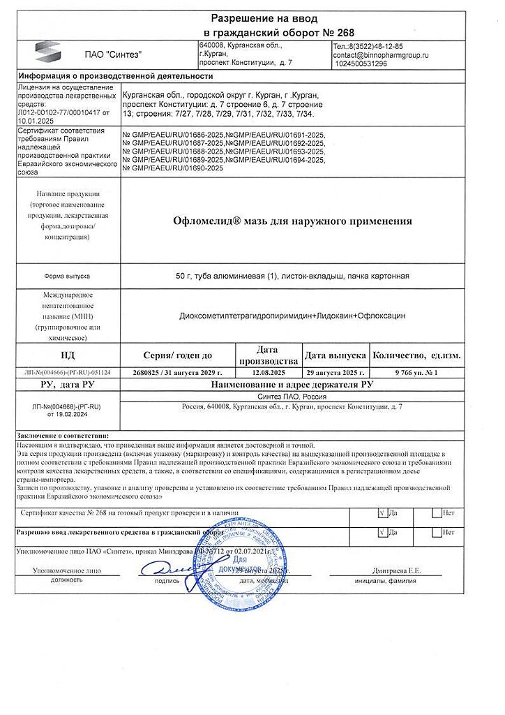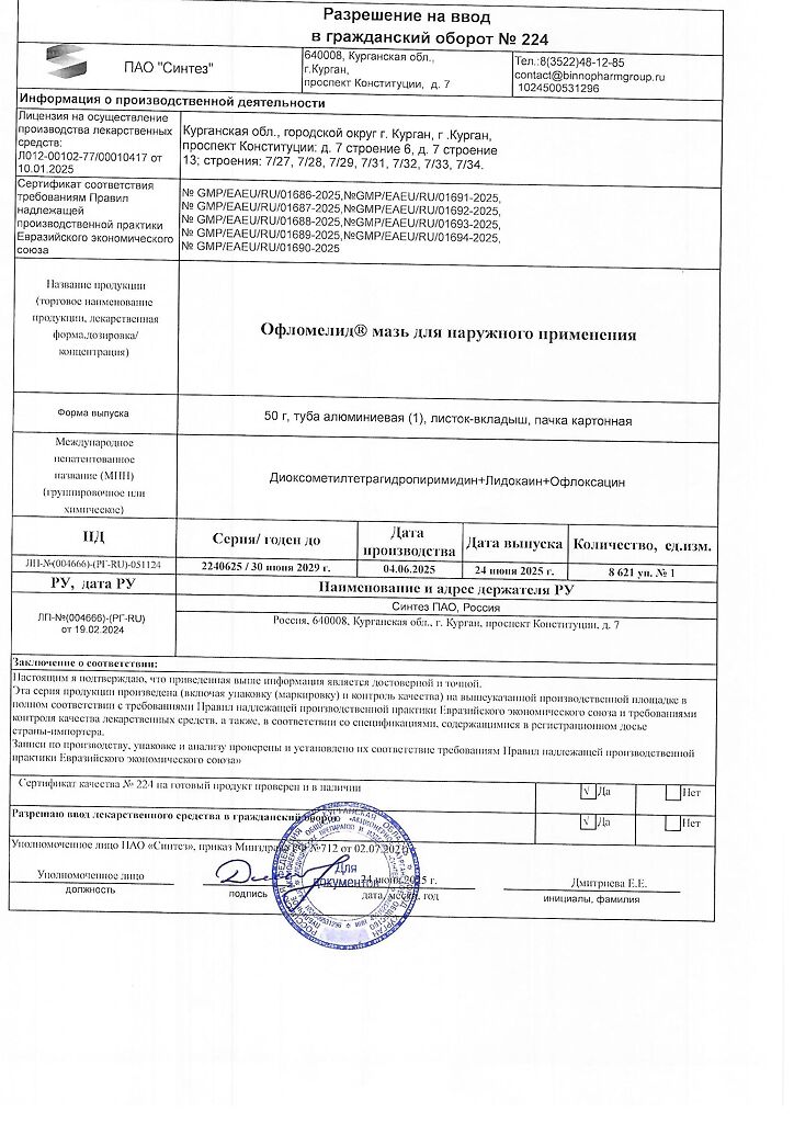 Действующее вещество: Диоксометилтетрагидропиримидин, Лидокаин, Офлоксацин