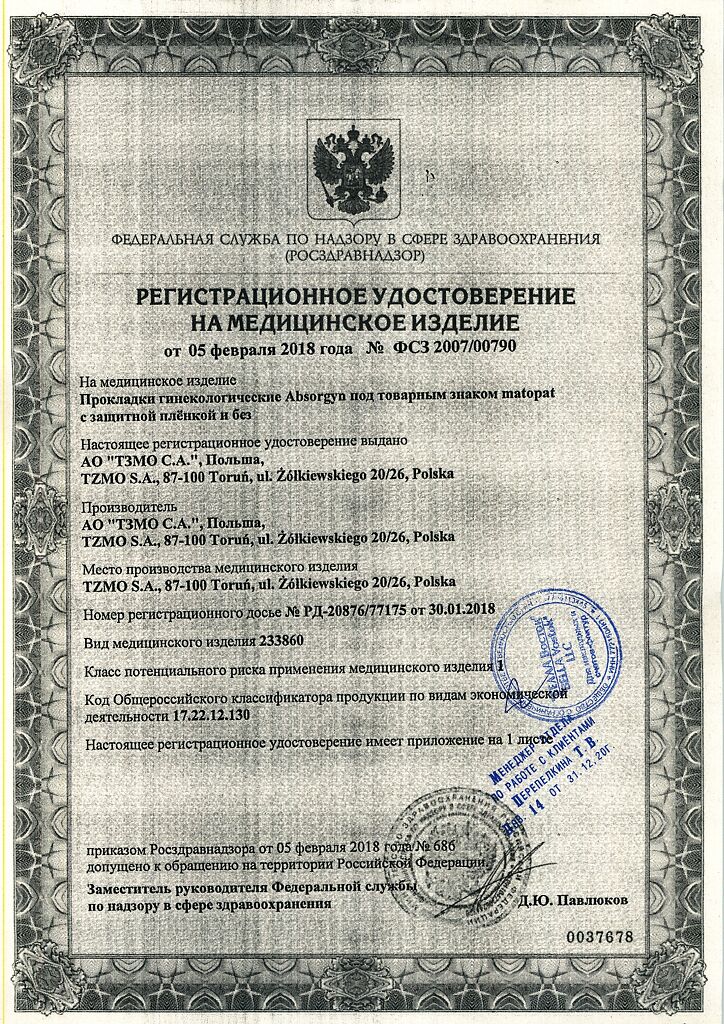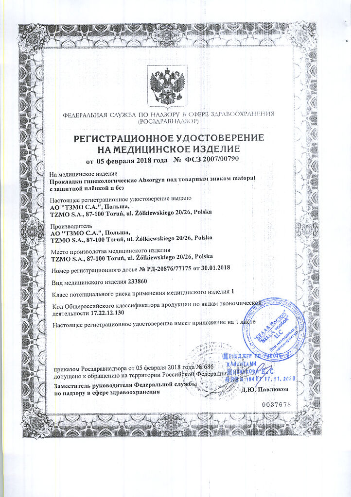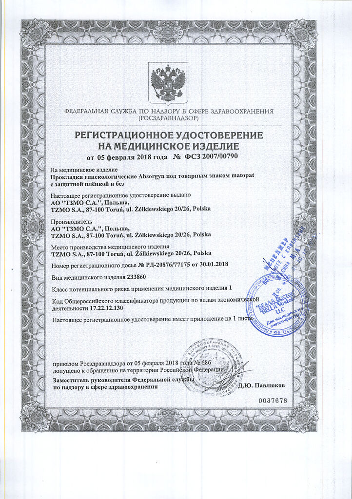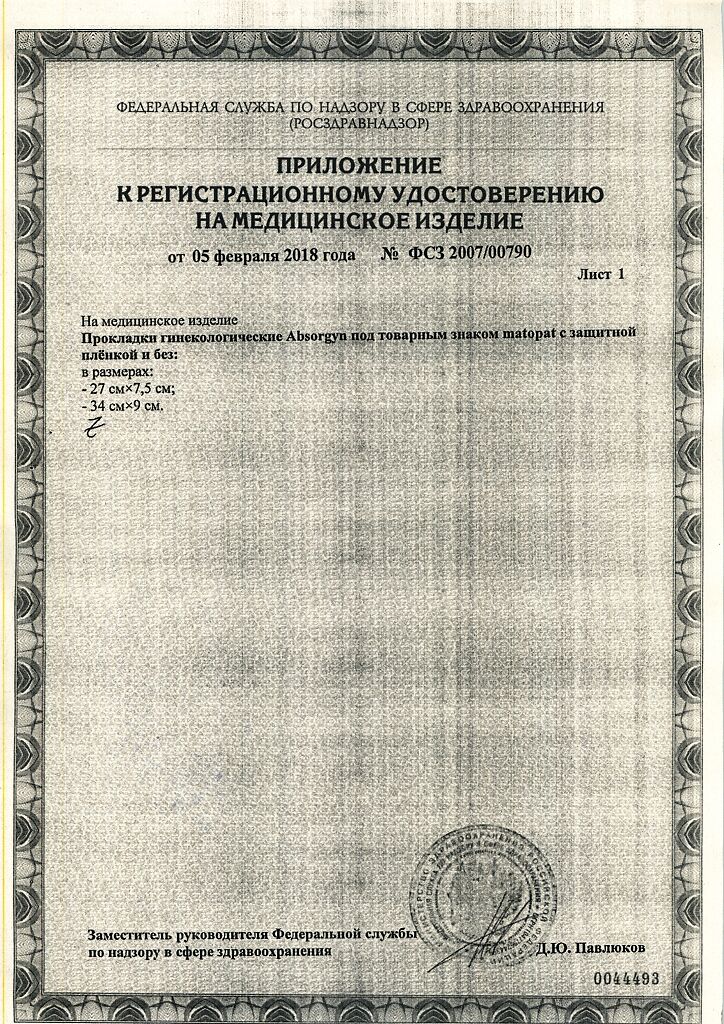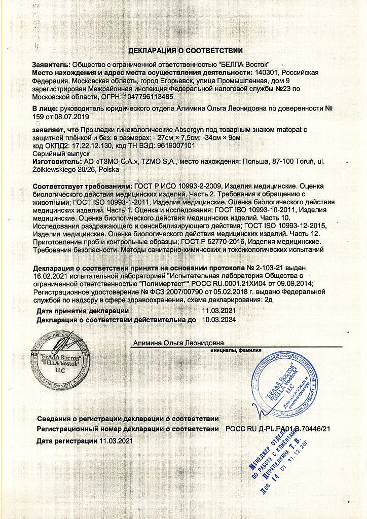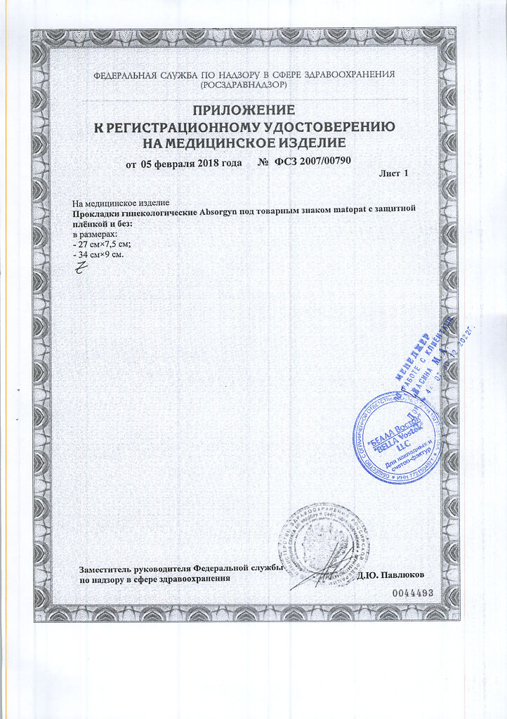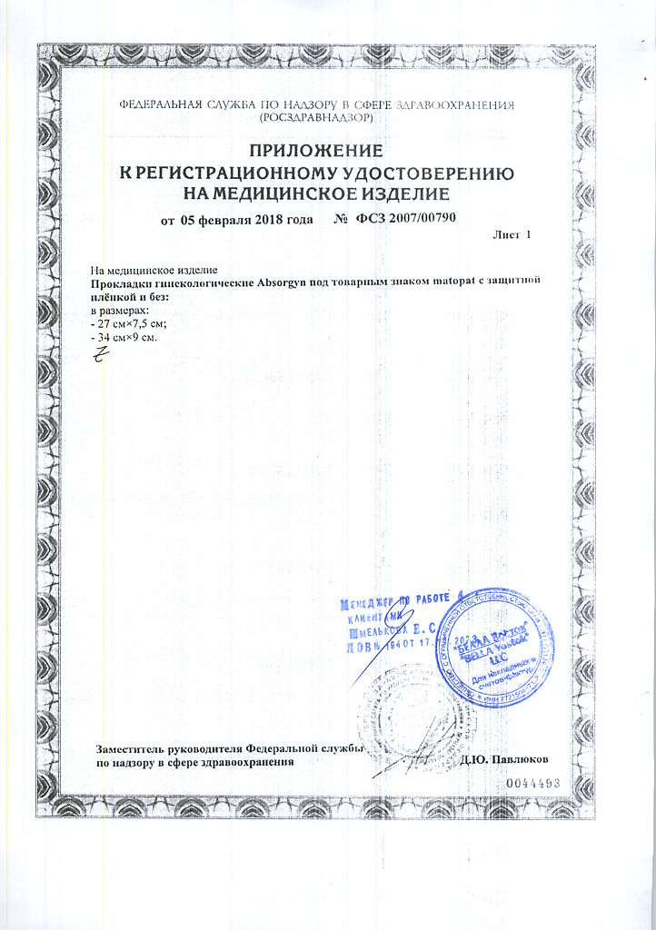 Документы Bella Матопат Прокладки гинекологические стерильные Absorgyn 27х7,5 см 10 шт