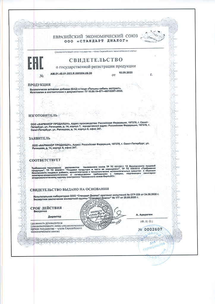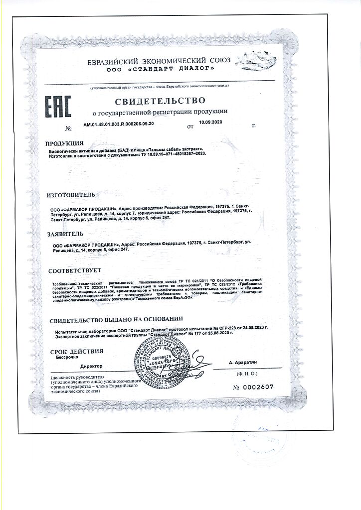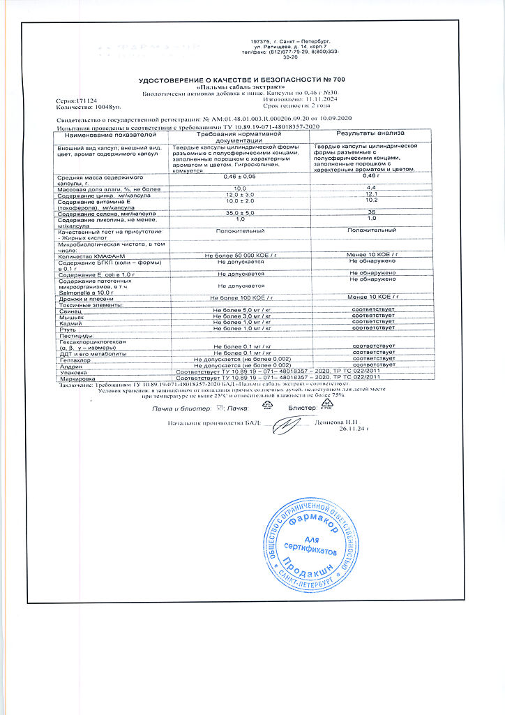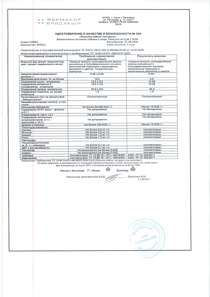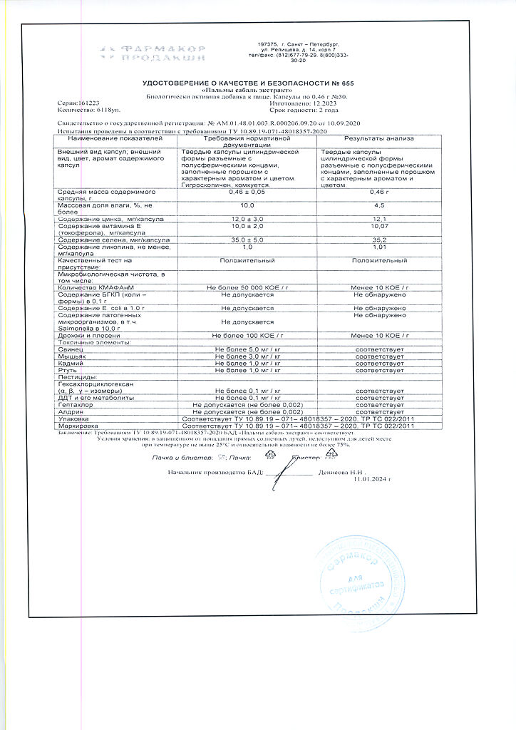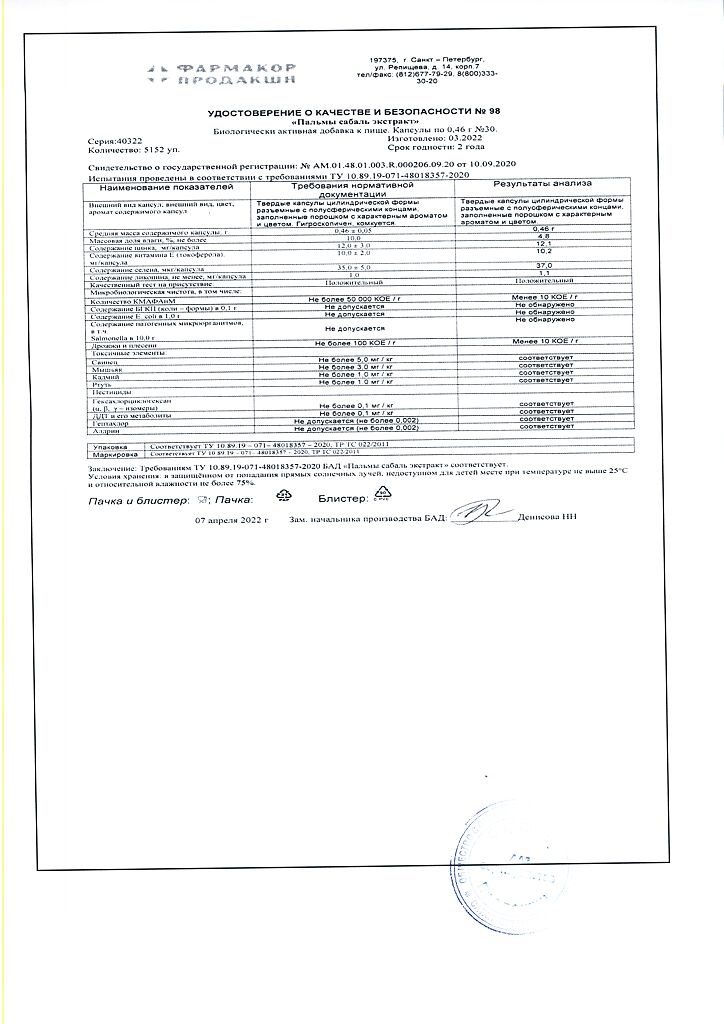 Документы Пальмы Сабаль экстракт капсулы по 0,46 г 30 шт
