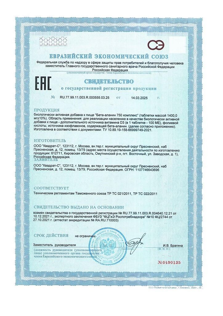 Документы Бета-Аланин комплекс 750 мг Витамир таблетки массой 1400 мг 30 шт