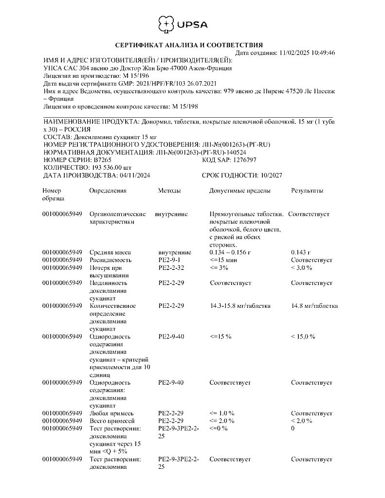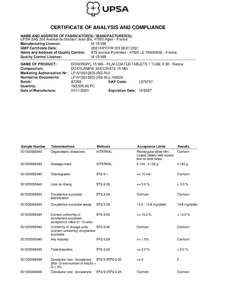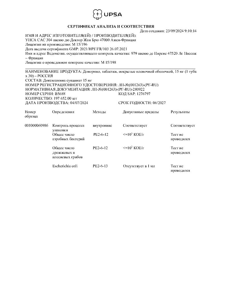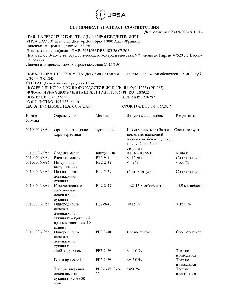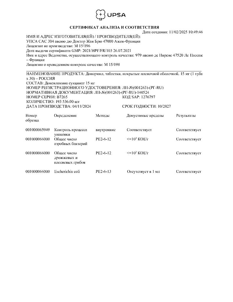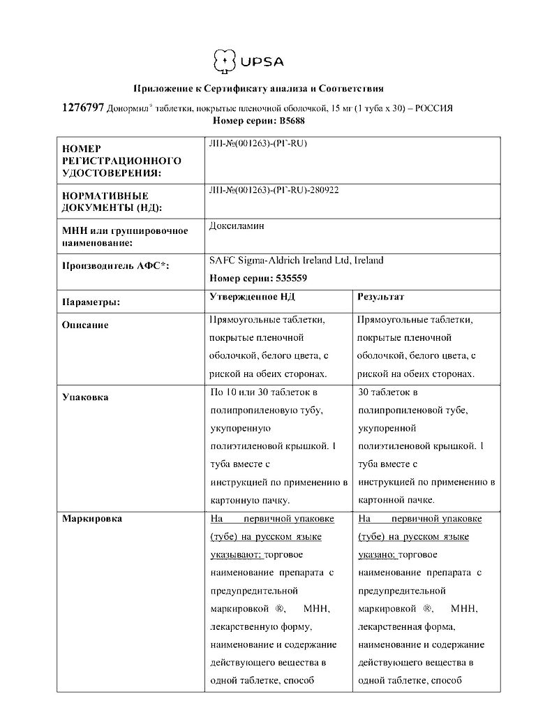 Документы Донормил таблетки покрыт.плен.об. 15 мг 30 шт