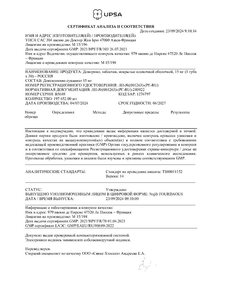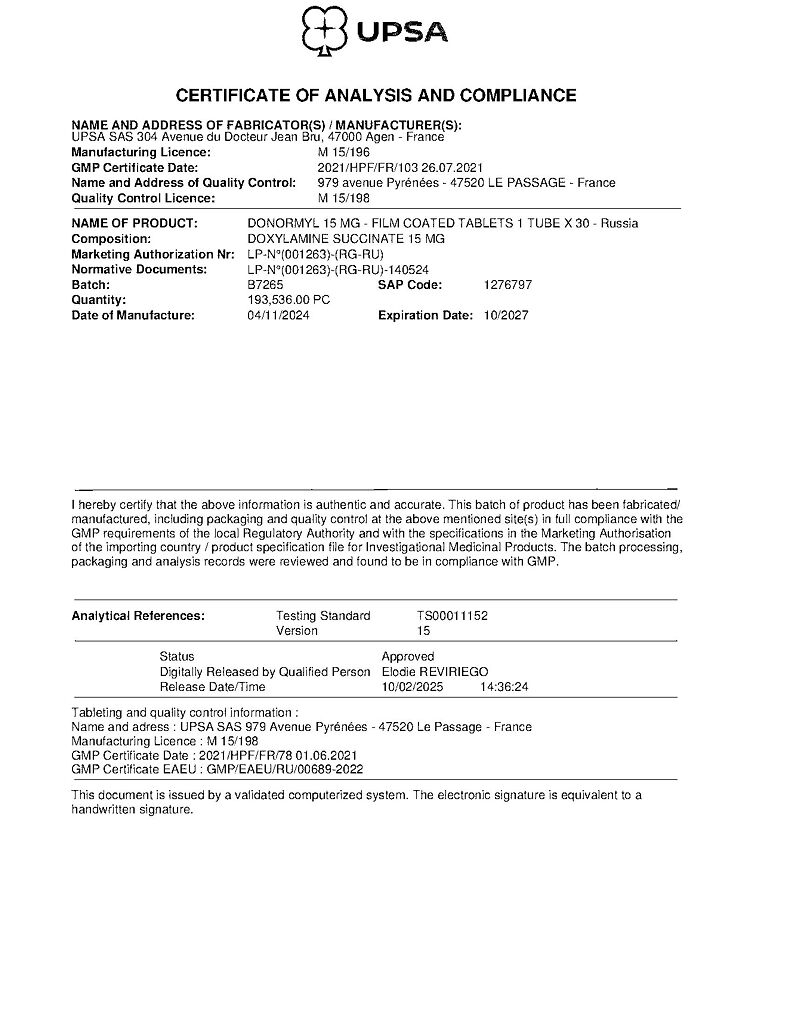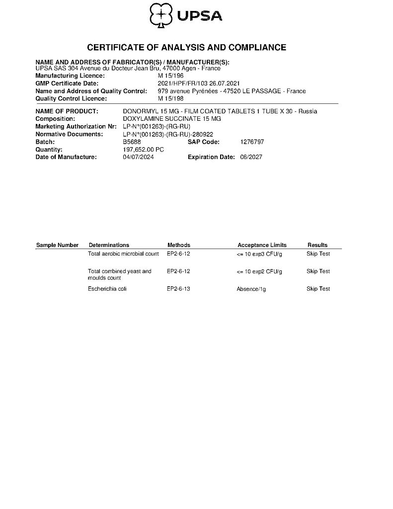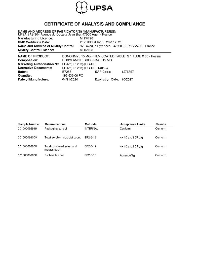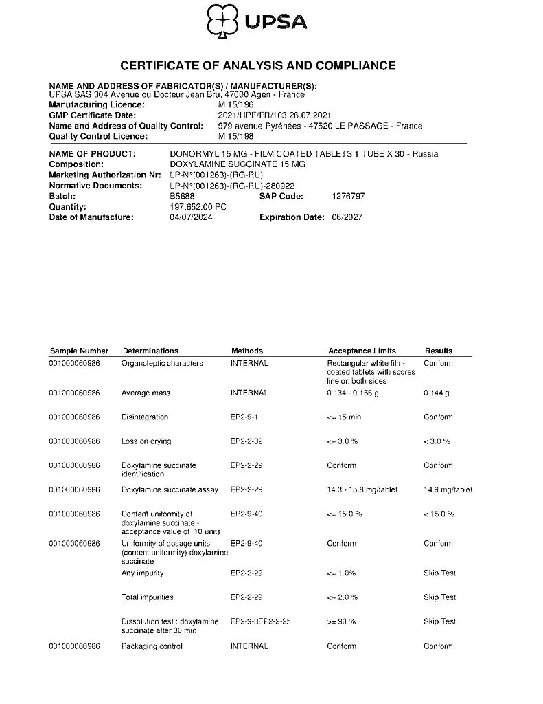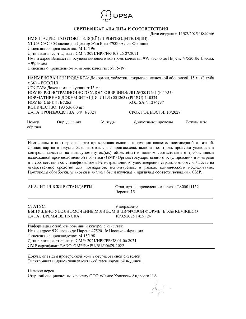 Документы Донормил таблетки покрыт.плен.об. 15 мг 30 шт