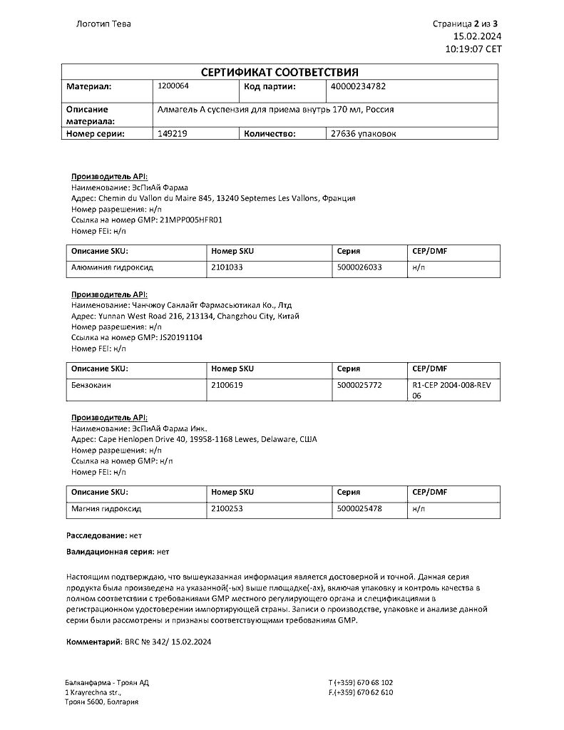 Действующее вещество: Алгелдрат, Бензокаин, Магния гидроксид