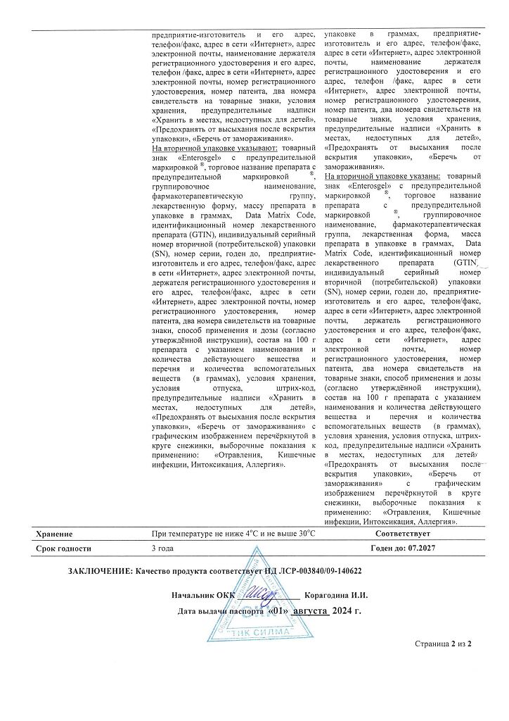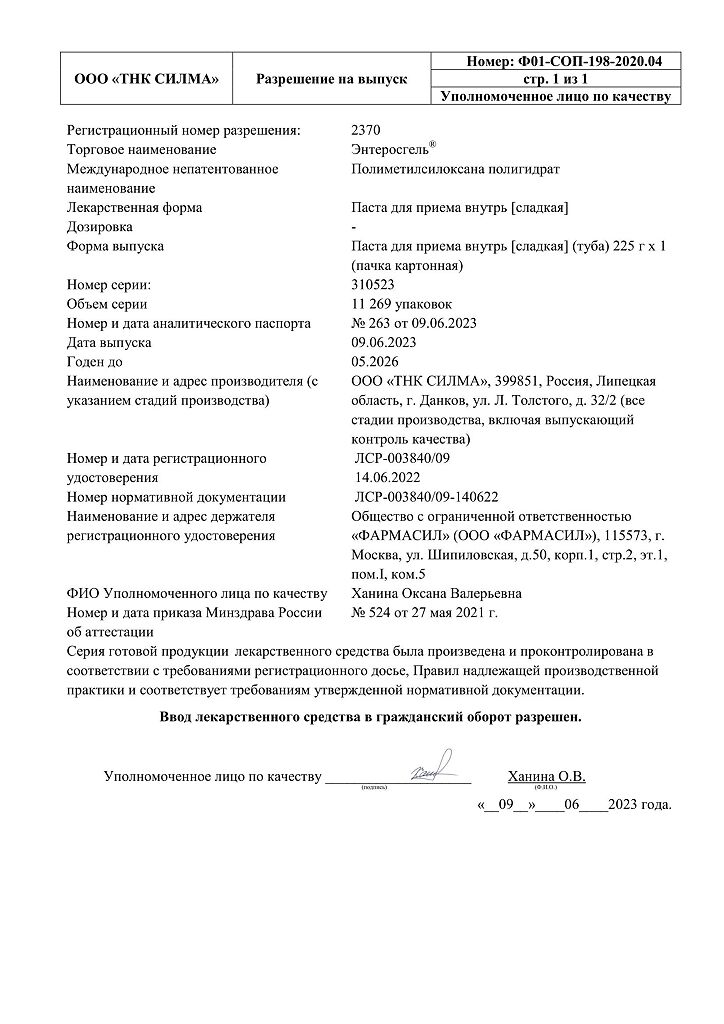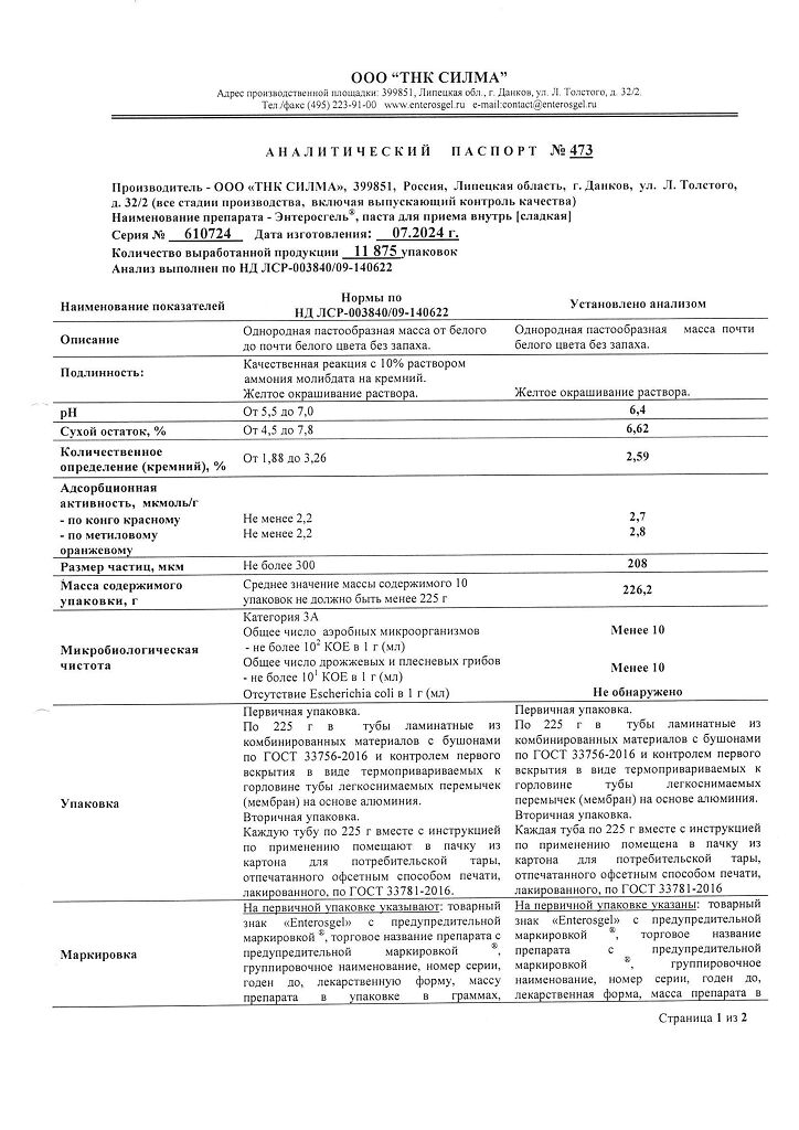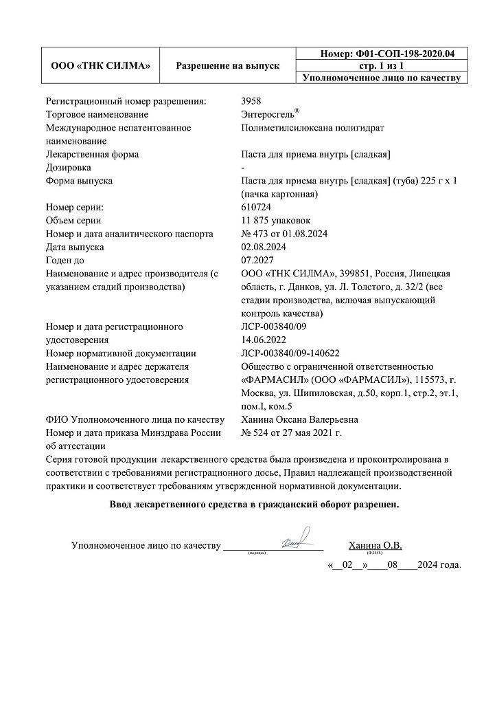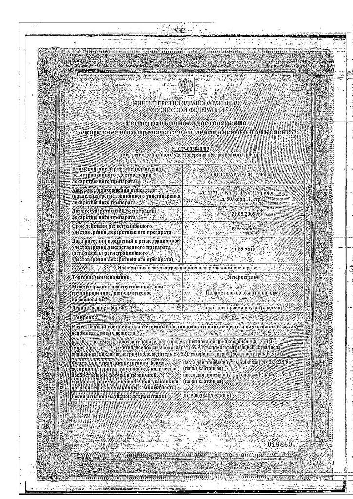 Документы Энтеросгель паста сладкая для приема внутрь 225 г 1 шт