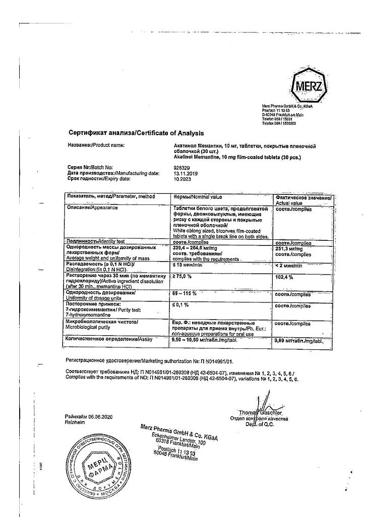 Действующее вещество: Мемантин
