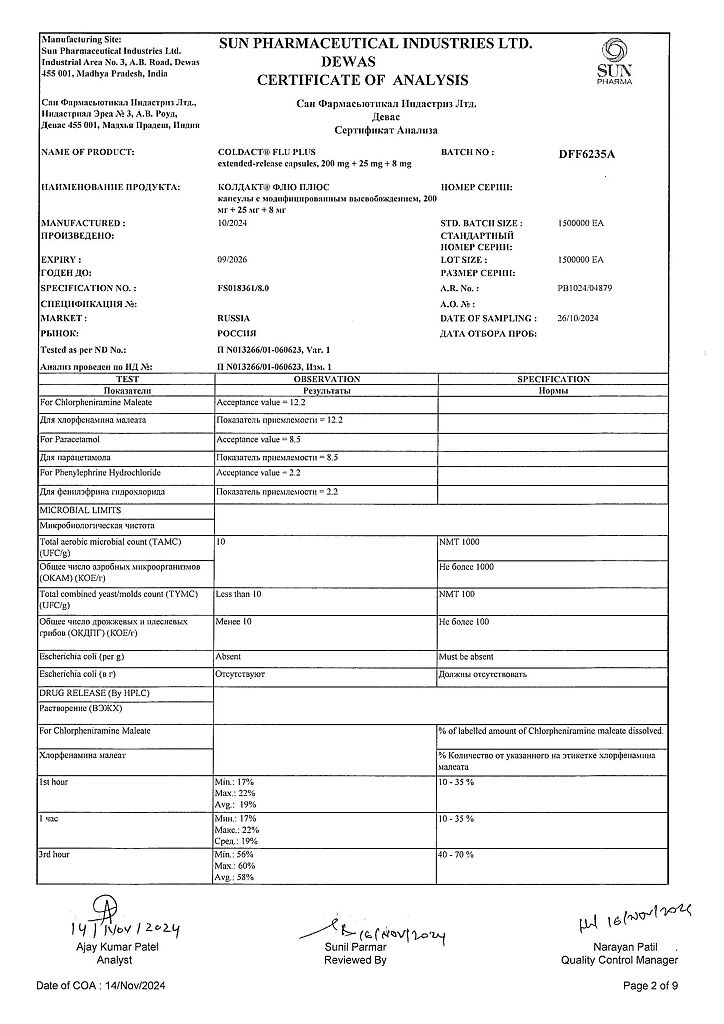 Действующее вещество: Парацетамол, Фенилэфрин, Хлорфенамин