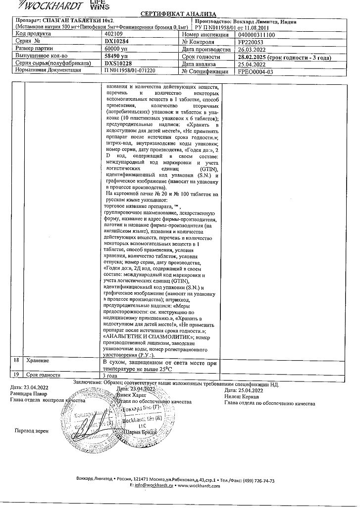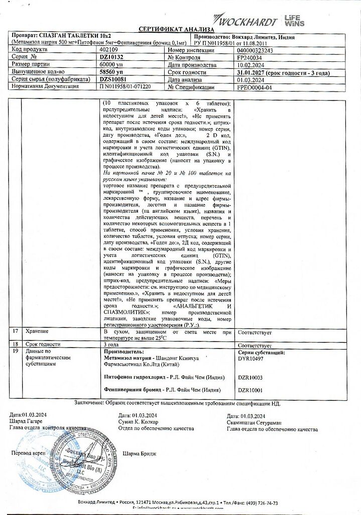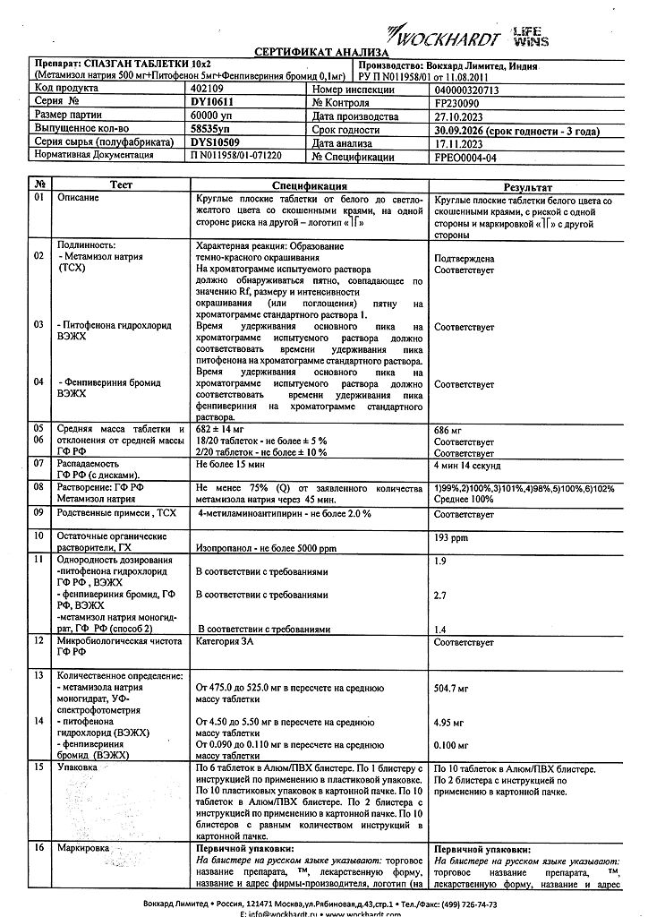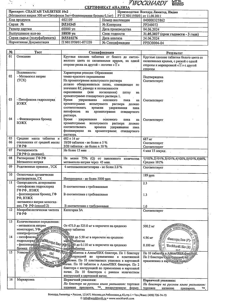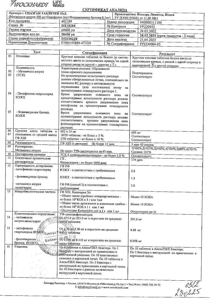 Действующее вещество: Метамизол натрия, Питофенон, Фенпивериния бромид