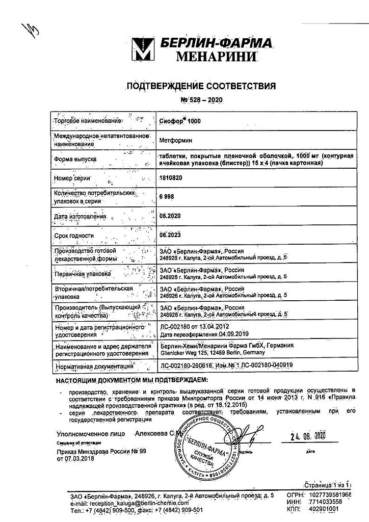 Документы Сиофор 1000 таблетки покрыт.плен.об. 1000 мг 60 шт