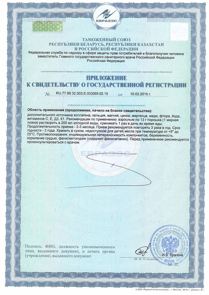Рекомендуется принимать в качестве биологически активной добавки к пище – дополнительного источника коллагена, кальция, магния, цинка, марганца, меди, фтора, йода, витаминов С, Е, Д3, К1.