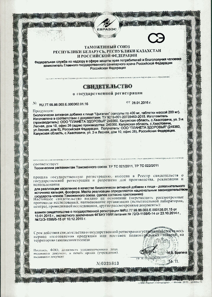 Документы Цыгапан таблетки массой 200 мг 30 шт