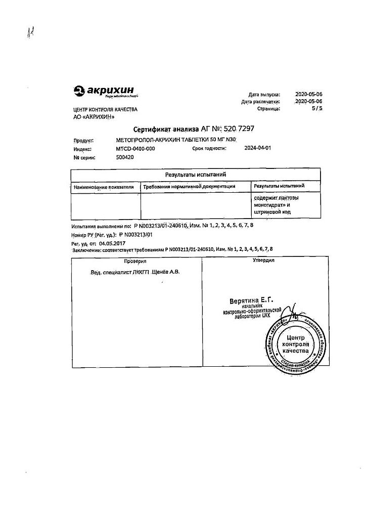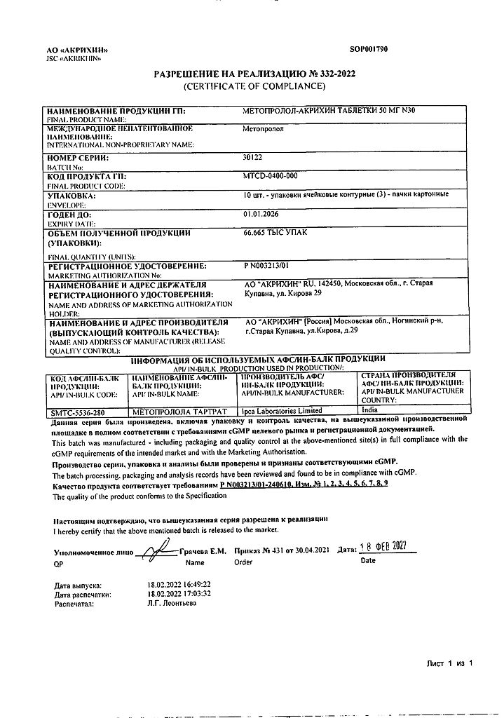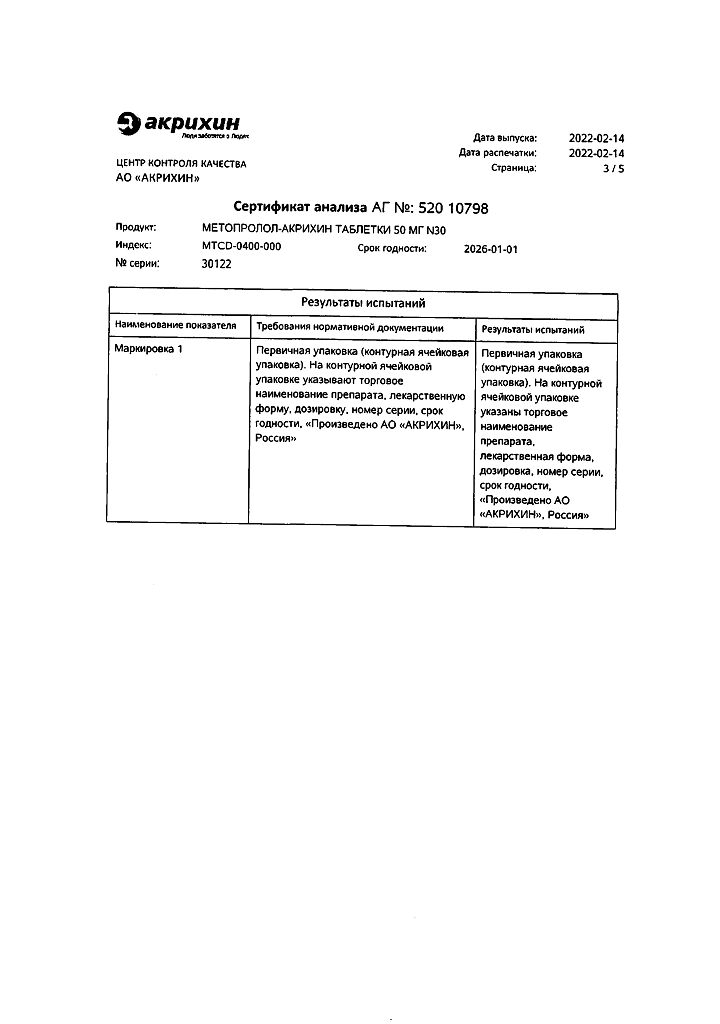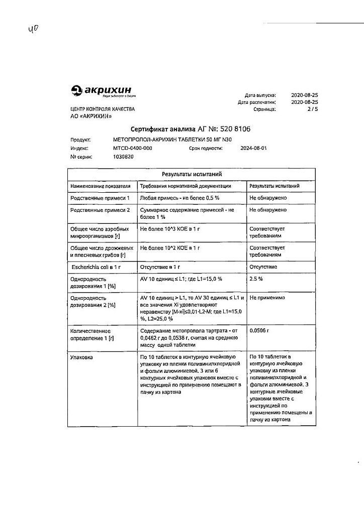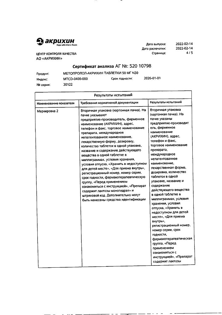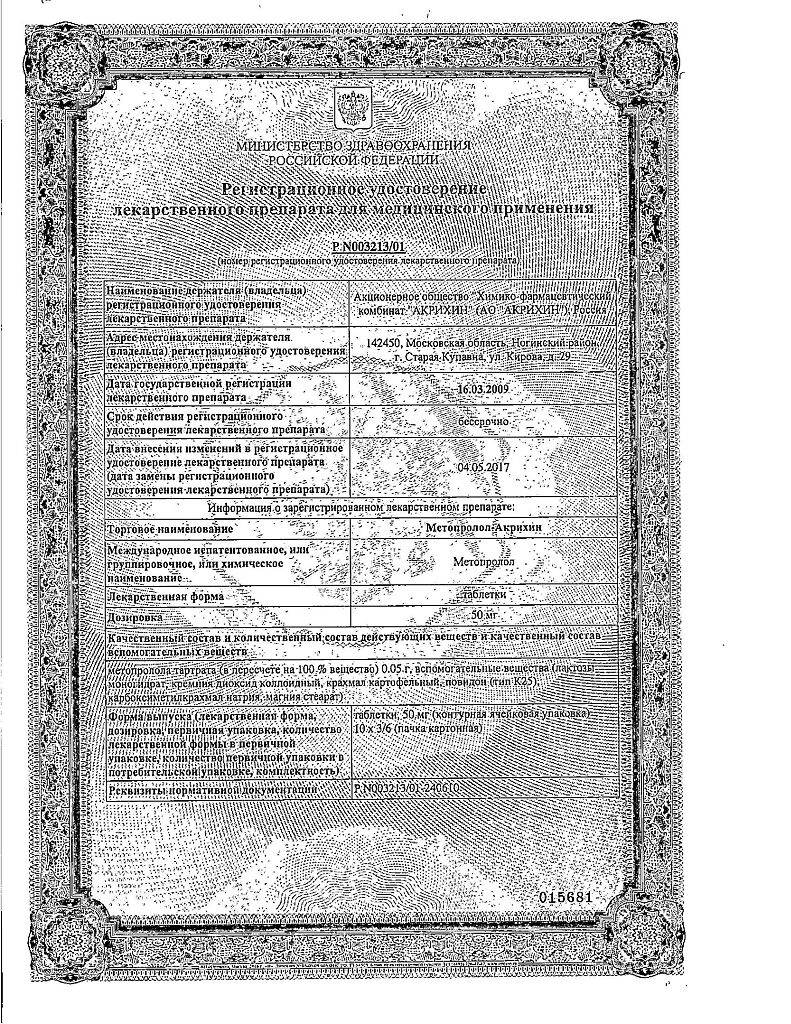 Документы Метопролол-Акрихин таблетки 50 мг 30 шт