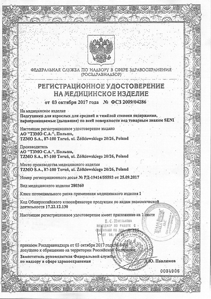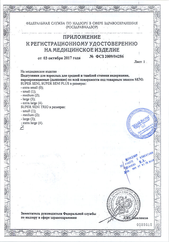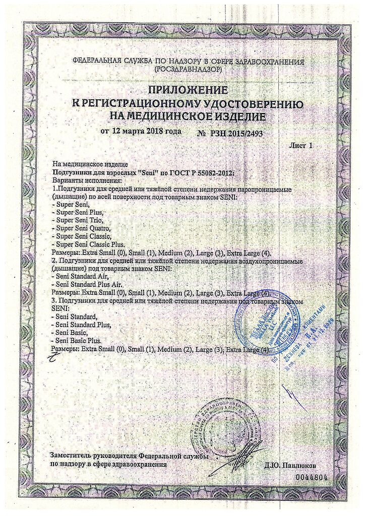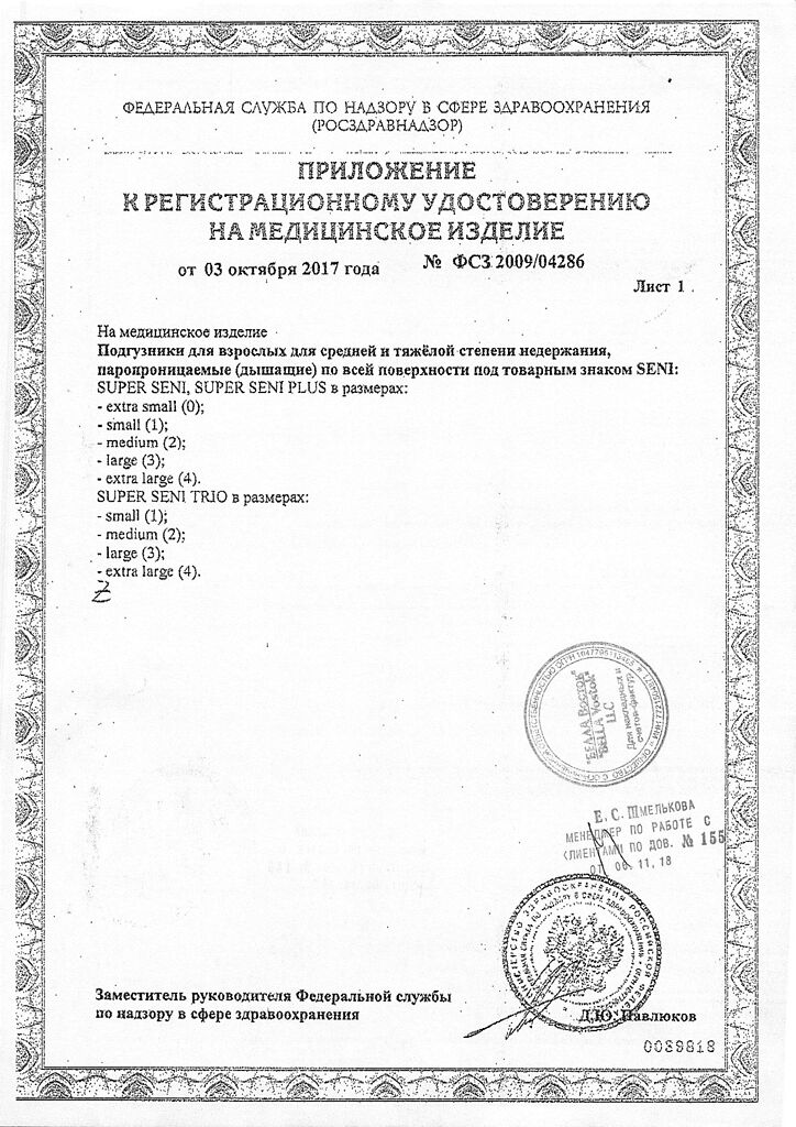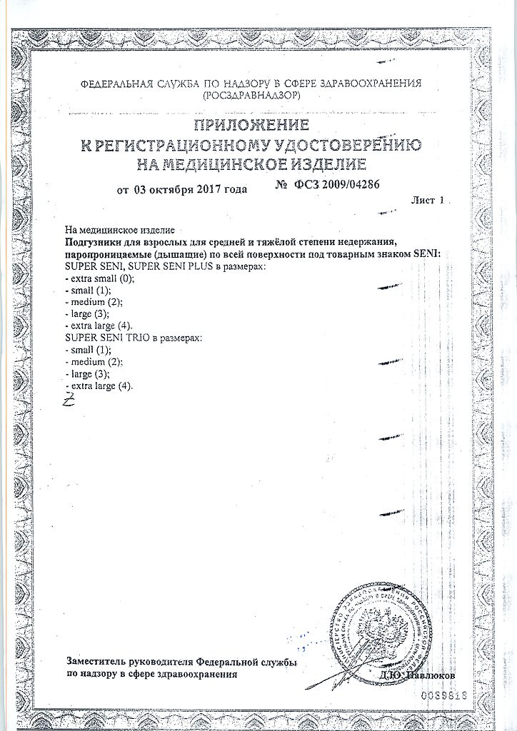Seni "Super Seni Plus" – "дышащие" подгузники для защиты при средней и тяжелой степени недержания мочи, предназначены как для активных людей, так и для людей с ограниченными двигательными возможностями. Двойная система крепления с помощью эластичных резинок в поясе сзади и спереди, а также двойных эластичных застежек-липучек обеспечивает надежное и комфортное использование. Имеется возможность многократного приклеивания и отклеивания застежек-липучек без риска разорвать внешний слой подгузников. Двойной впитывающий слой с суперабсорбентом гарантирует высокий уровень впитываемости. Специальная система Odour Stop нейтрализует неприятный запах. Внутренние боковые бортики защищают от протеканий. Отсутствие латексных элементов (Latex Free) снижает риск появления аллергических реакций на латекс. Индикатор влагонасыщения показывает меру наполнения, информируя о необходимости смены подгузника. обладают повышенной впитываемостью, идеальны для применения в ночное время.