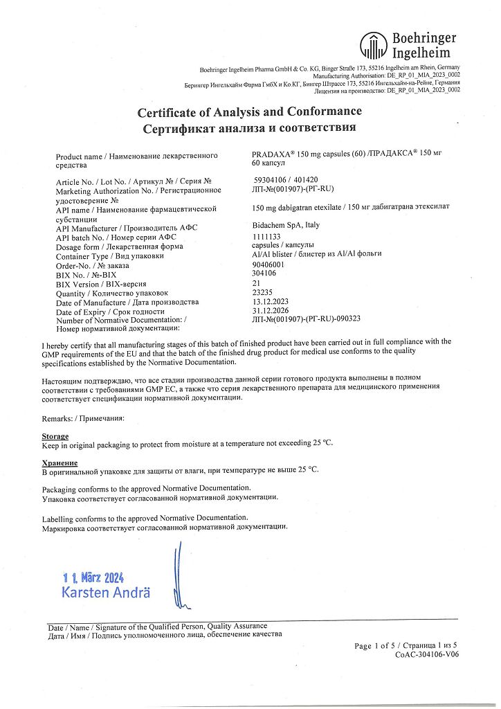 Действующее вещество: Дабигатрана этексилат