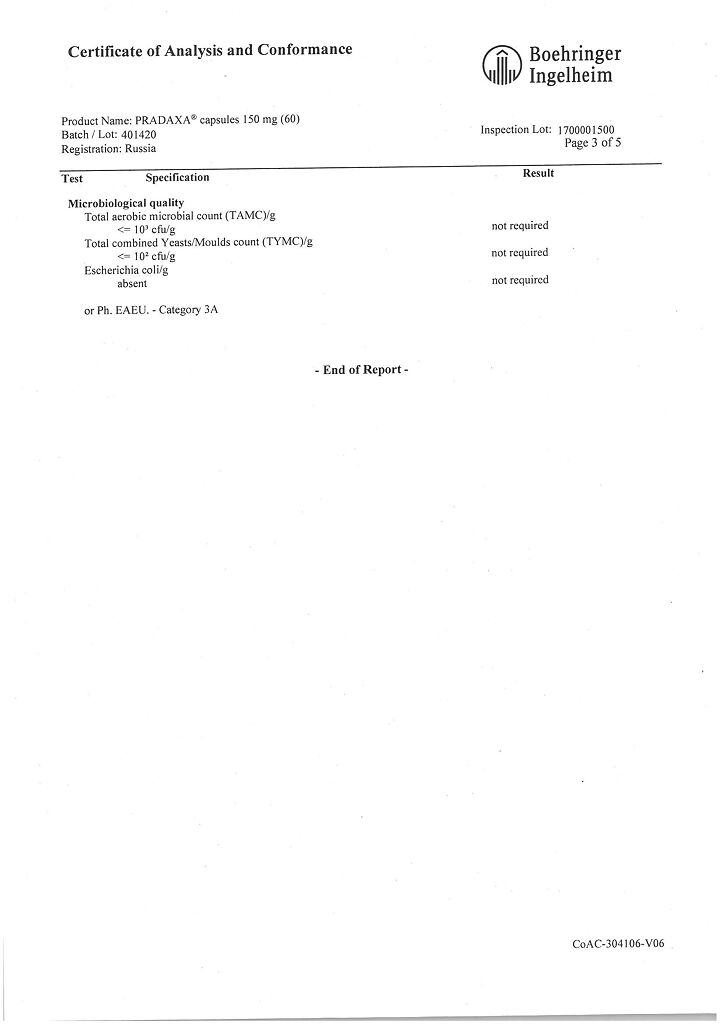 Показана эквивалентность антитромботического эффекта дабигатрана этексилата при применении 150 мг или 220 мг по сравнению с эноксапарином в дозе 40 мг в сутки при оценке основной конечной точки, которая включает все случаи венозных тромбоэмболий и смертность от любых причин.