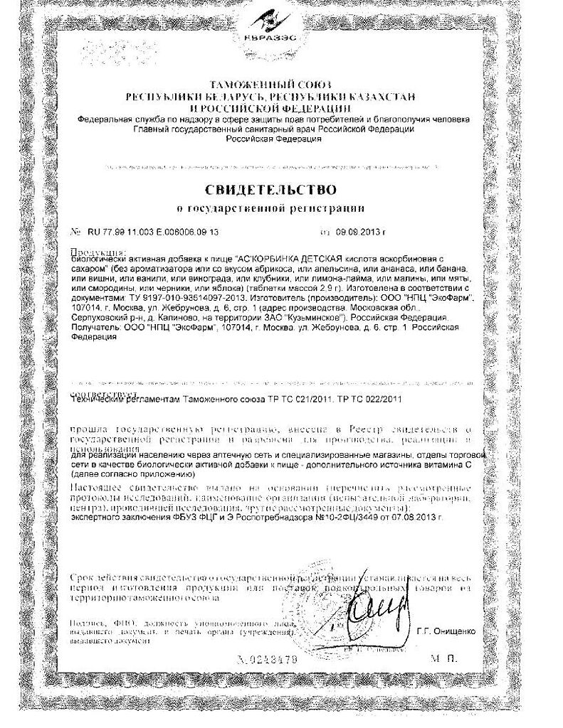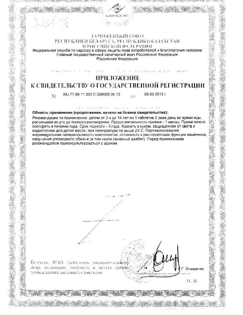 Биологически активные вещества, мг/табл, не менее: аскорбиновая кислота - 20,0.Детям от 3-х до 14 лет по 1 таблетке 2 раза день во время еды, рассасывая во рту до полного растворения. Продолжительность приема - 1 месяц. Прием можно повторять в течение года.