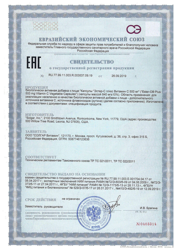 Документы Solgar Эстер-С плюс витамин С 500 мг / Ester-C Plus 500 mg Vitamin C Vegetable Capsules капсулы массой 840 мг 50 шт