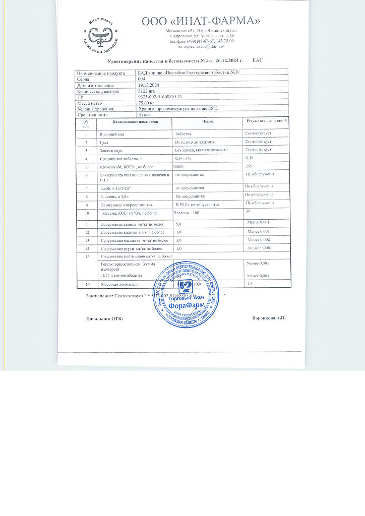 Лактулоза 70%, лактоза, стабилизатор кальция стеарат, носитель кремния диоксид (Е551).
