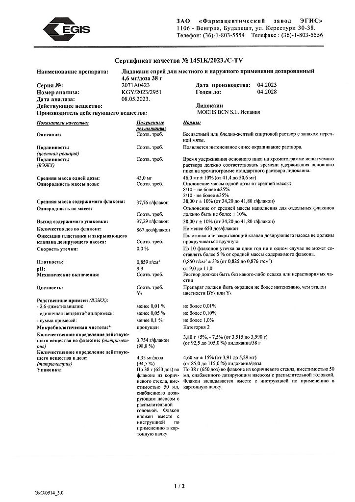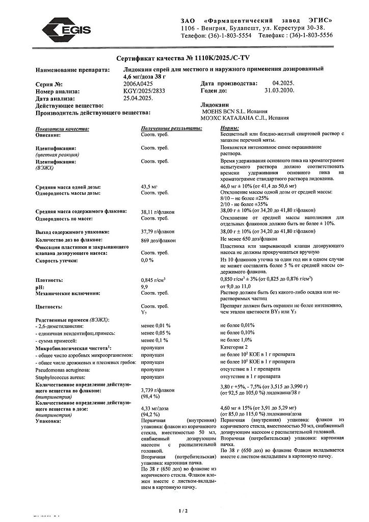Документы Лидокаин спрей для местного и наружного применения дозированный 4,6 мг/доза 38 г 1 шт