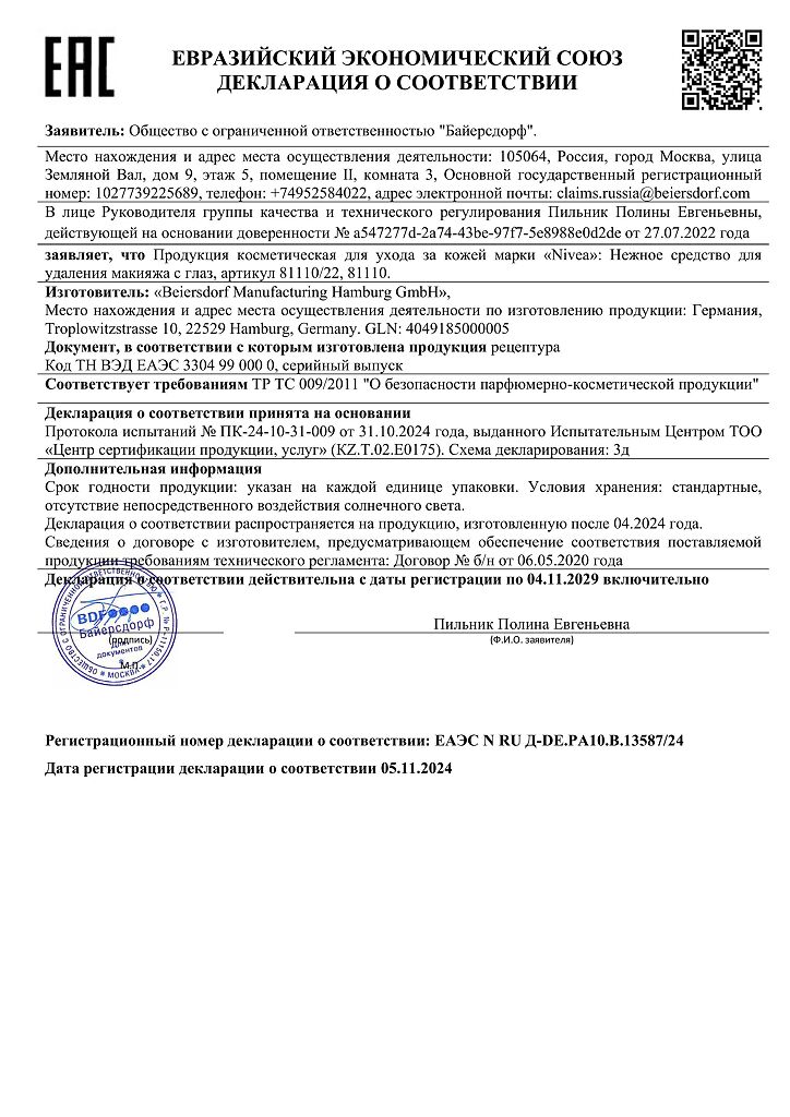 Документы Nivea Нежное средство для удаления макияжа с глаз 125 мл 1 шт