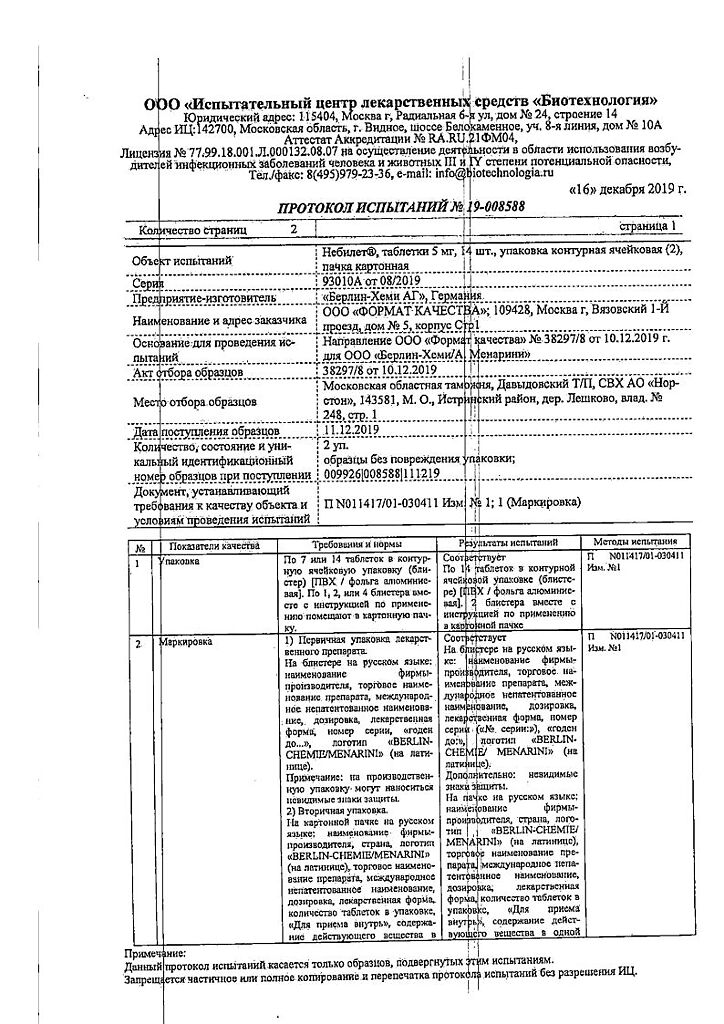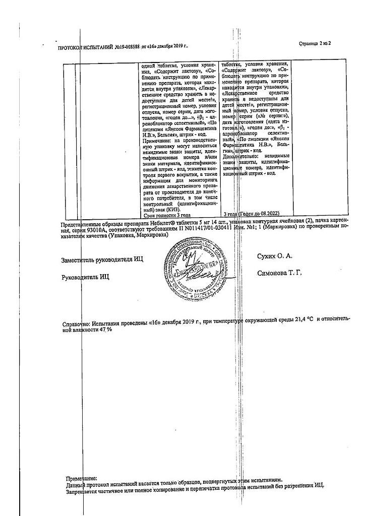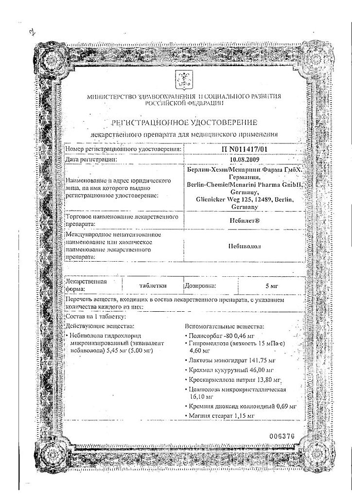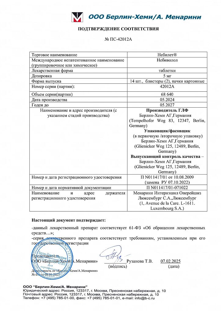 небиволола гидрохлорид микронизированный 5,45 мг, что соответствует содержанию небиволола 5 мг.